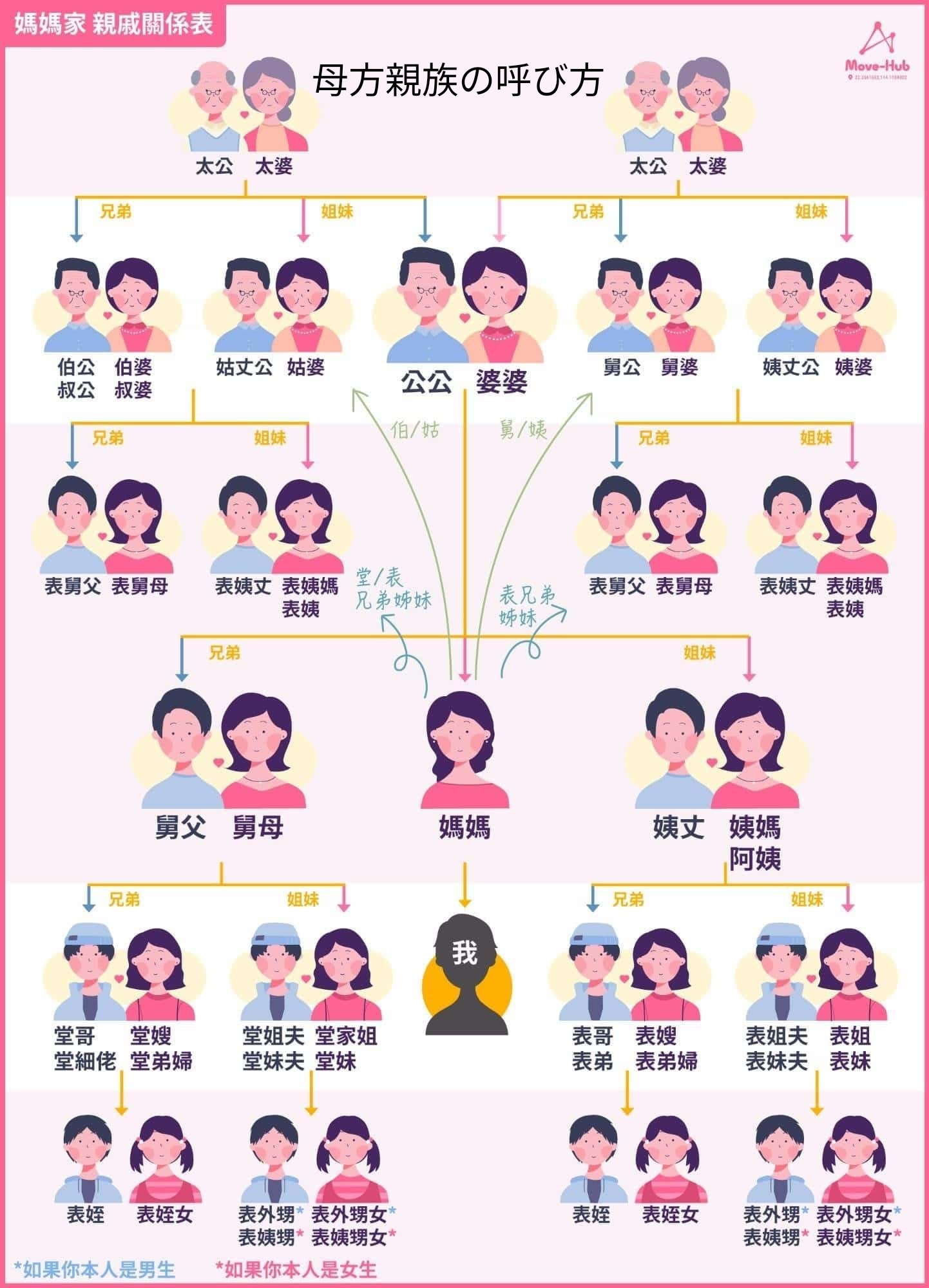 @haruotpe この絵は多分香港の国語表記です。普通話とも台湾の国語ともは違います。台湾語(閩南語)だとまた違うので大変です。中国語圏全体の傾向だと女性や母方親戚の呼び方はかなり地域によって変わります。