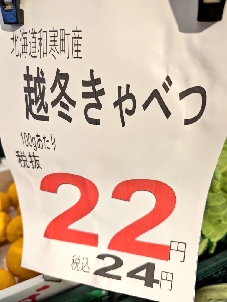 @aerolitkurofune キャベツ、グラムあたりで値段表記してるの初見!でも、これレジで会計するとき、いちいちグラム計るのか、それともグラム計って値札はっておくんだろうか?従業員さん、大変😭