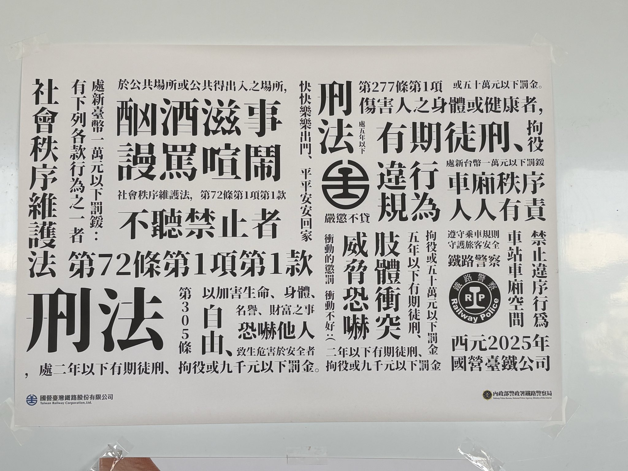 @esthebird 《鉄道での違法行為と、罰金、根拠となる法律など》社会秩序維持法。以下の行為の者は、1万台湾ドルの罰金。公共の場での飲酒と騒動。忠告を無視する者他人の健康脅かし、危害加える者、有期刑楽しく出かけて安全に帰宅身体にぶつかり恐喝50万元以下罰金、5年以下刑期2026年国営台湾鉄道 https://t.co/1ACBuEG23t