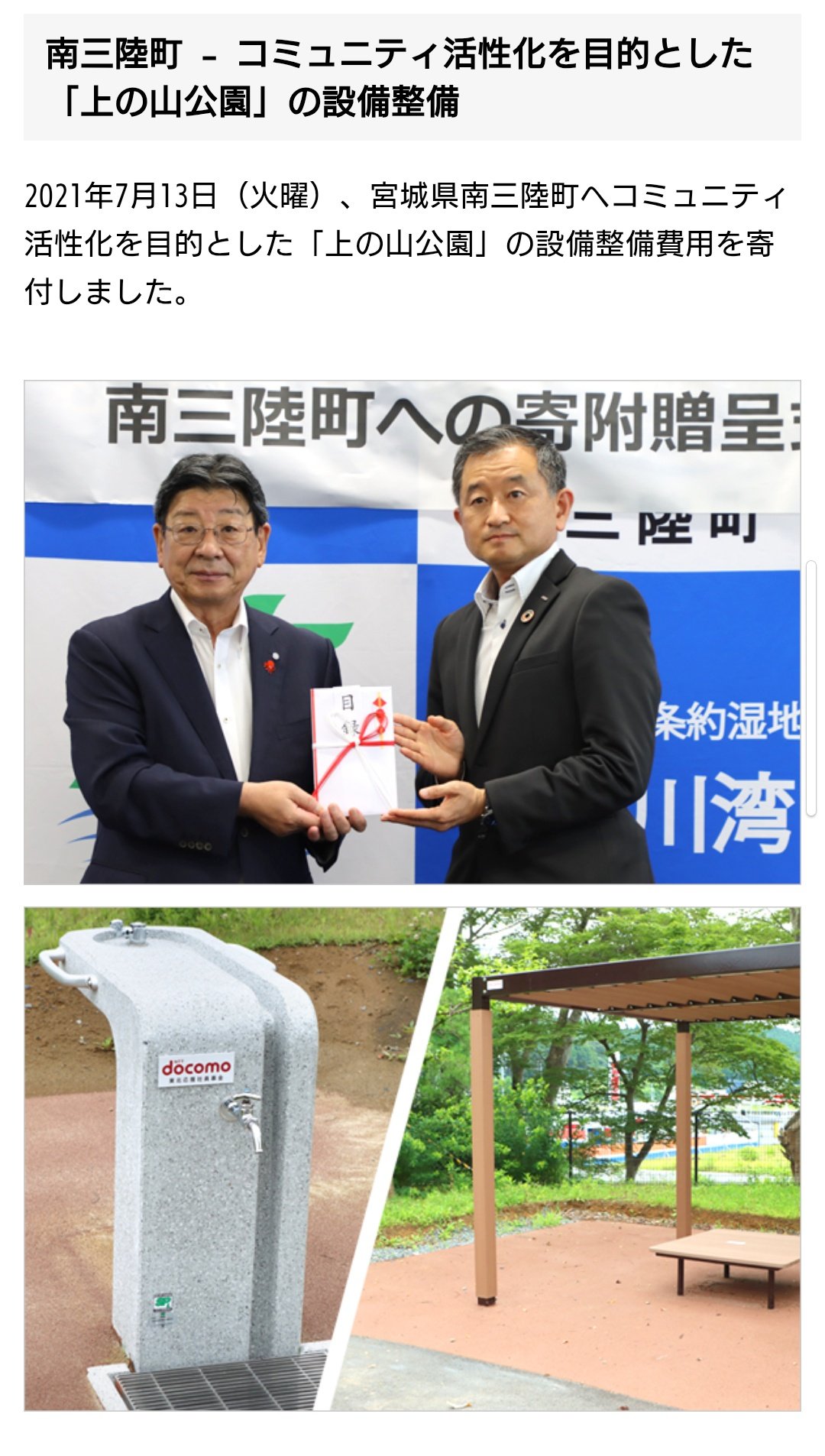 これかな>宮城県南三陸町へコミュニティ活性化を目的とした「上の山公園」の設備整備費用を寄付しました。「東北応援社員募金」の寄付概要(2020年度)https://t.co/aZ5GDLswr0※社員からの募金および社員募金と同額のマッチング寄付(会社からの寄付)を加え、東日本大震災の被災地支援を実施 https://t.co/4JREqpcyGS