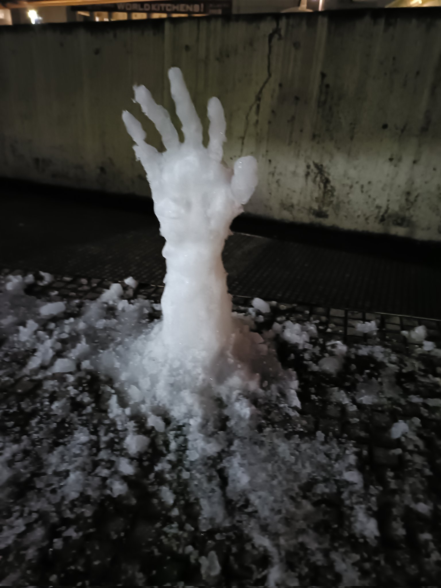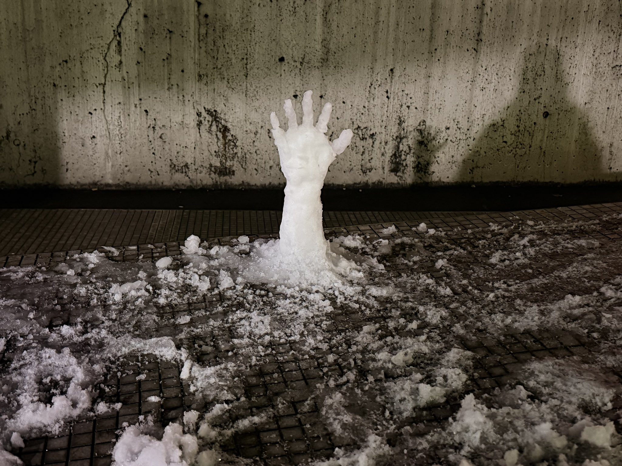 ワンフェスの帰り、幕張メッセからのバス乗ろうとしたらめちゃくちゃ秀逸な手の雪だるま(?)があってじゃっかんびびりました。流石ワンフェスって感じ🖐️ https://t.co/lIj51Ahp2k