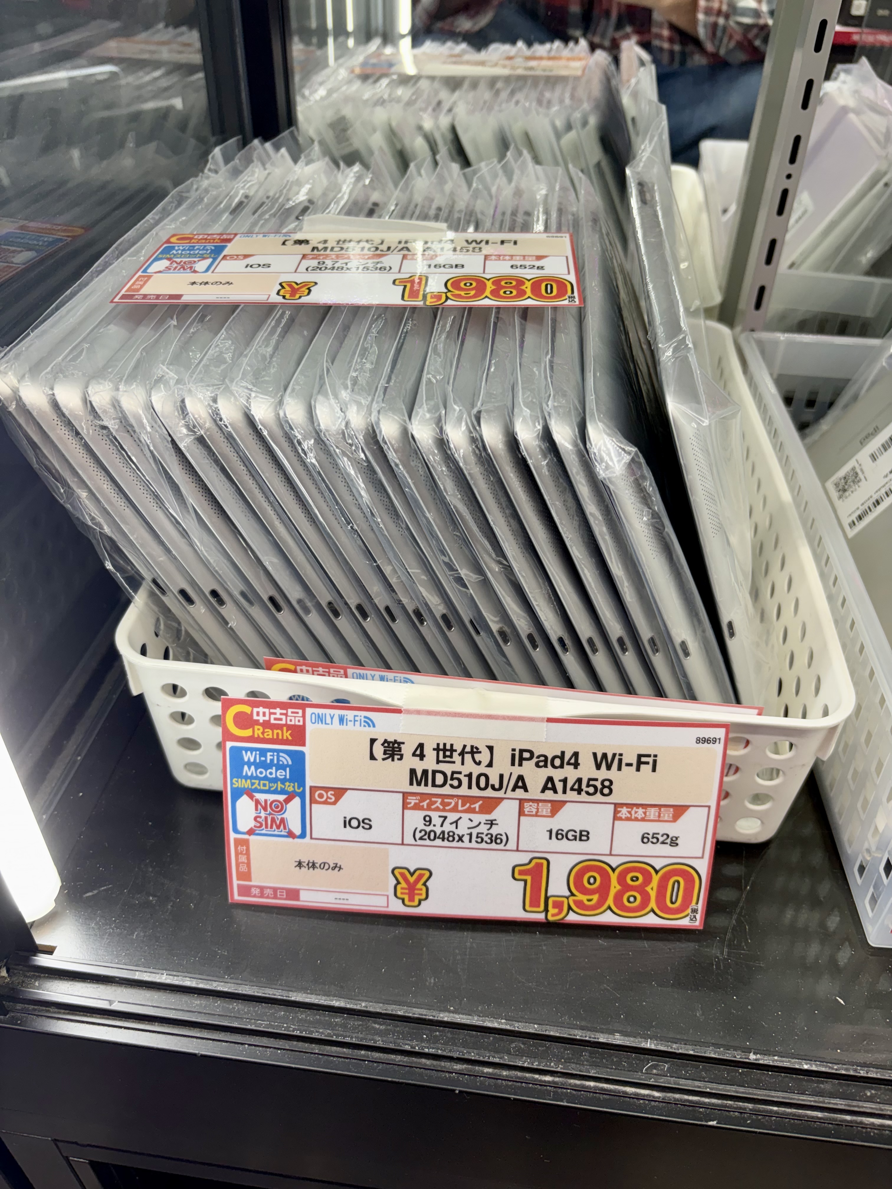 13年前発売のあの機種が!?iPad 第4世代がドドーンと大量入荷!総数なんと200台超😲発売が2012年末なので、iPad OS的にできることは限られていますが、お値段たった1,980円💰お子様のおもちゃには丁度良いのでは、、、?大量に仕入れてお待ちしております!まとめ買いも大歓迎です!是非! https://t.co/rnAf031GWQ