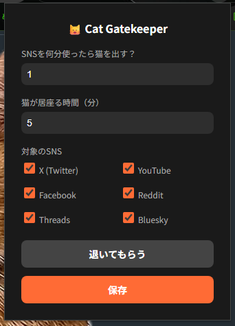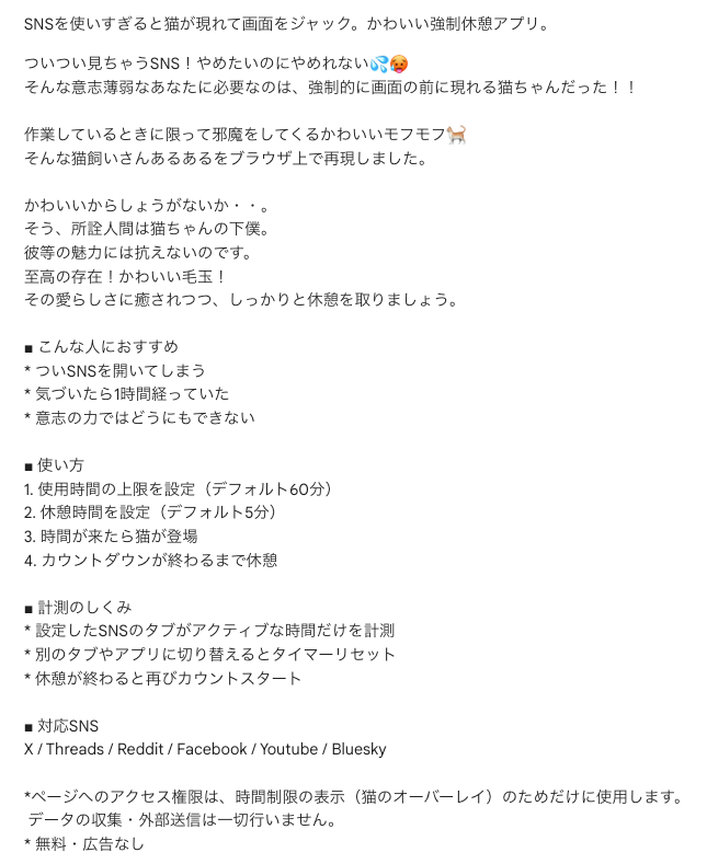 猫ちゃんの強制休憩アプリを作りました!SNSをやりすぎると猫ちゃんがあらわれて画面を占領します🐈 https://t.co/Jt56HVF1OT