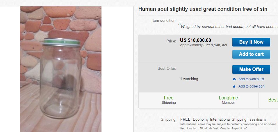ネットオークションですげえモン売ってる人がいたww 2017/3/12 6:00 画像 スポンサードリンク [投稿元ツイート:まくるめさん] Human soul slightly used great condition free of sin | eBay 23グラムなんでしょうか。