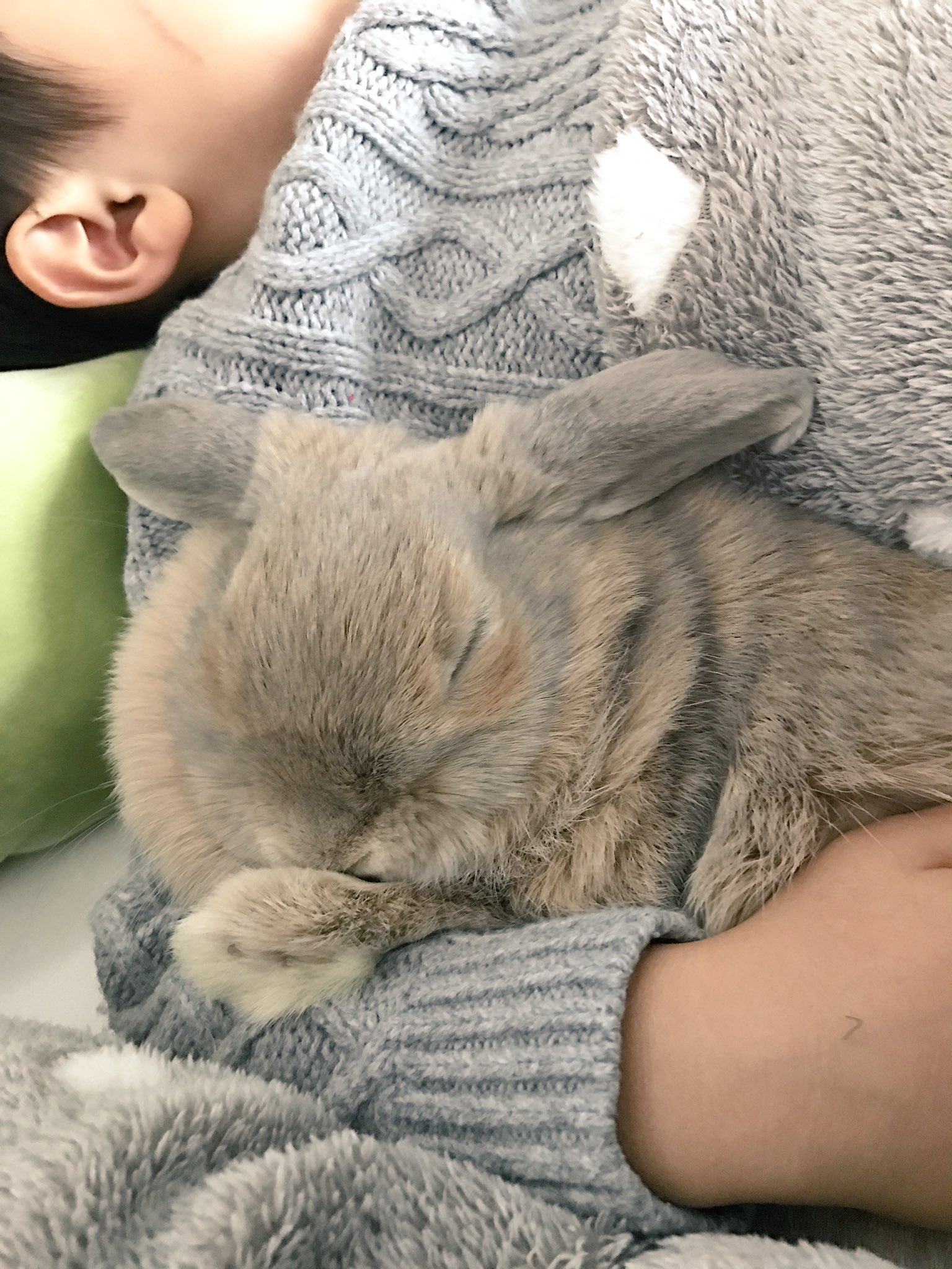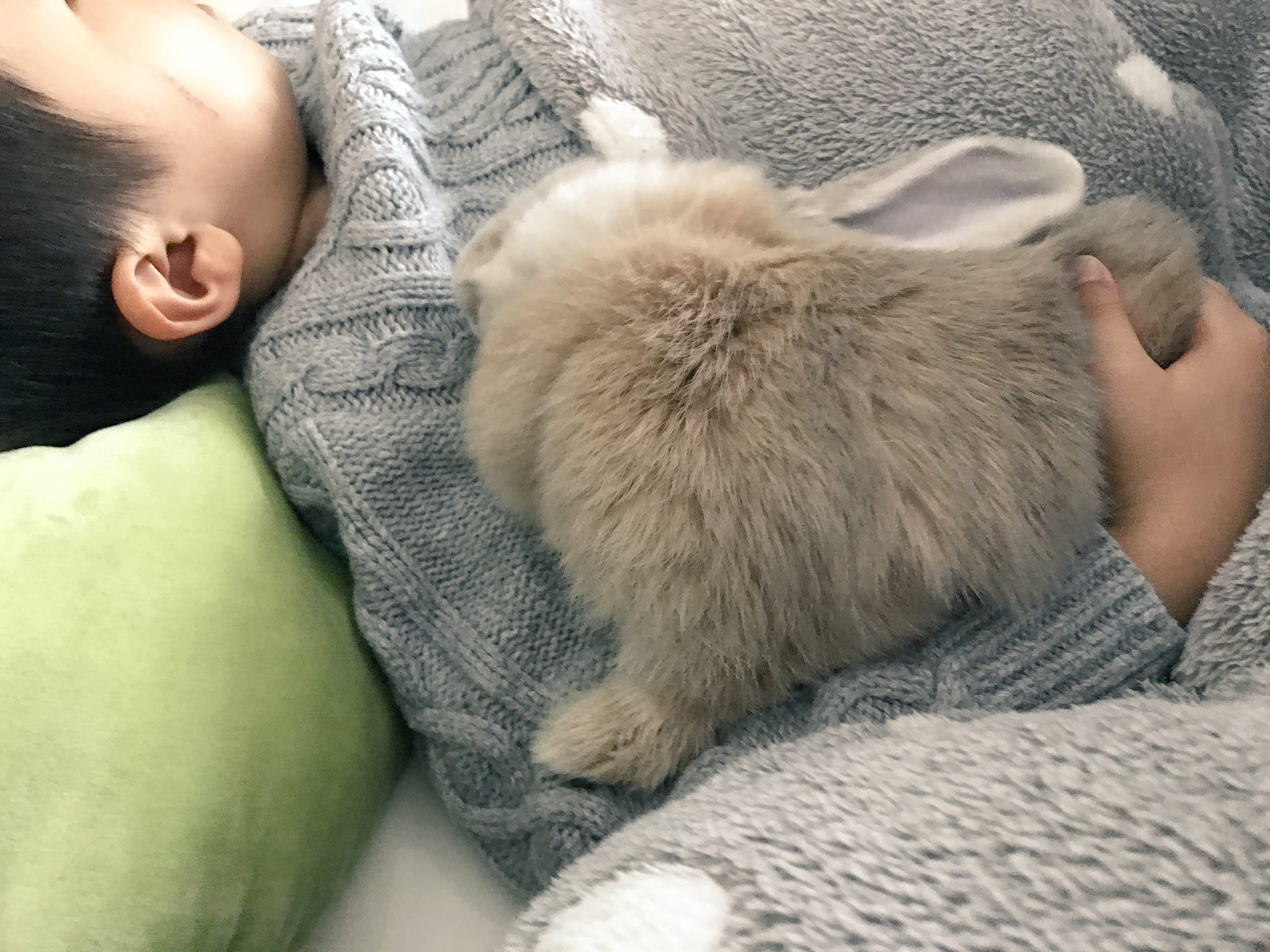 息子の隣に来てゴロンしたと思ったら腕の中で寝だしたw🐰💤(*´꒳`*)💕