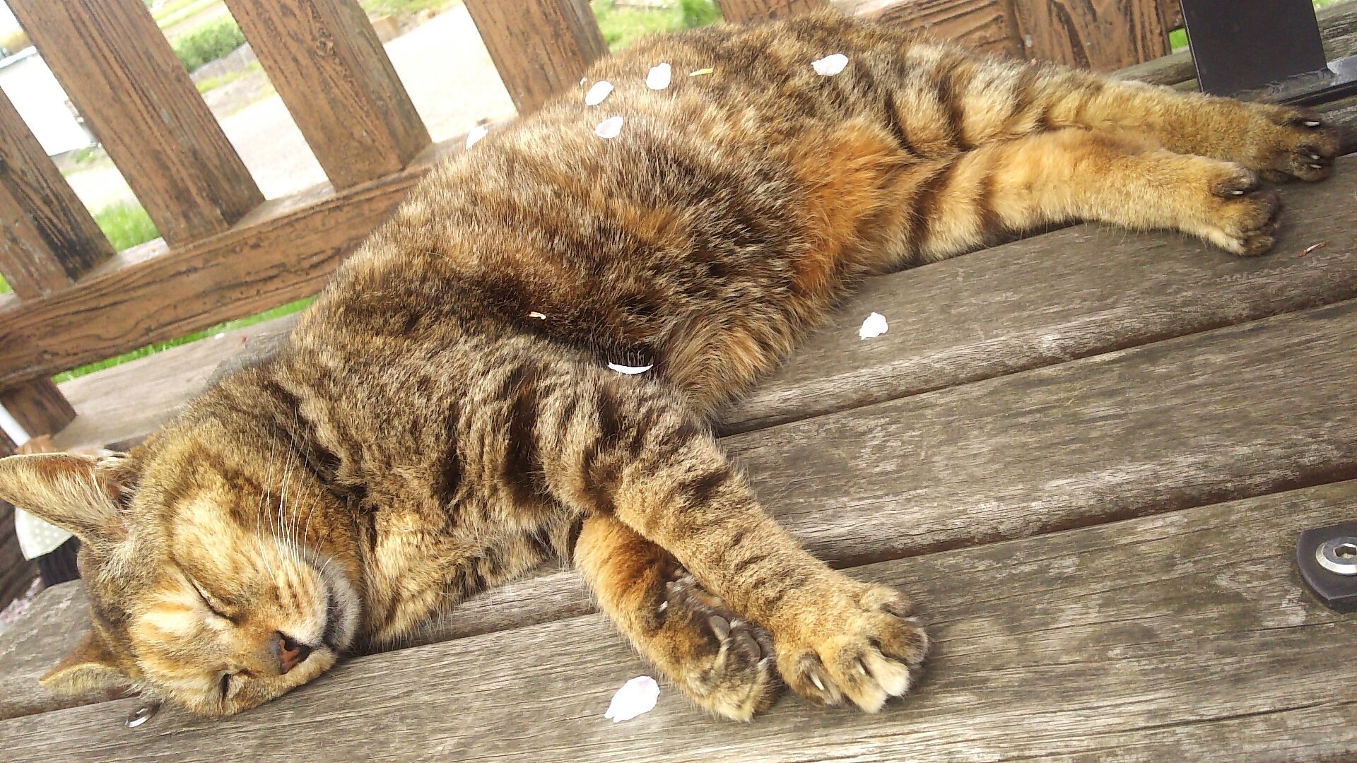 熟睡中の野良猫に桜吹雪がつもってた🌸