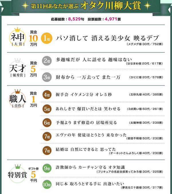 【激痛】オタク川柳が流行ってるということで、過去の大賞作品を見てみましょう 2018/1/26 19:00 画像 0 スポンサードリンク [投稿元ツイート:聖[ひじり]さん] [投稿元ツイート:聖[ひじり]さん] [投稿元ツイート:聖[ひじり]さん] [投稿元ツイート:聖[ひじり]さん] やめたげて!! #オタク川柳