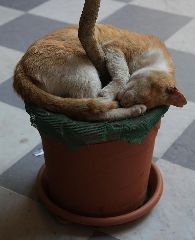 鉢植えの樹木からパワーを吸収する猫たち😽