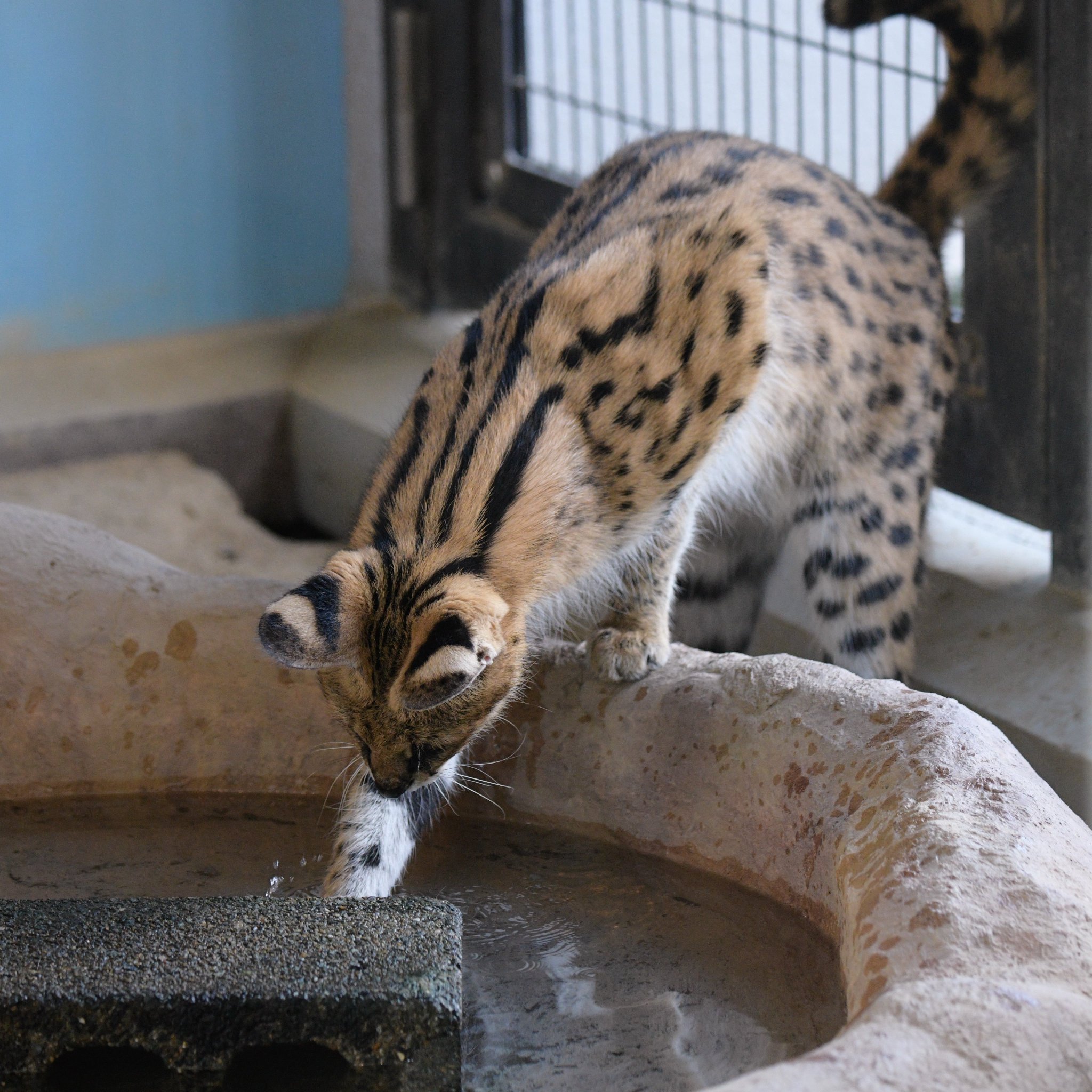 おやつの鶏肉が地面に落ちて砂まみれに…かんでみたけどジャリジャリだ!水で洗えばいいことを知っている賢いサーバル、カエデきれいにしておいしくいただきました#福山市立動物園 https://t.co/OowsG59EEI