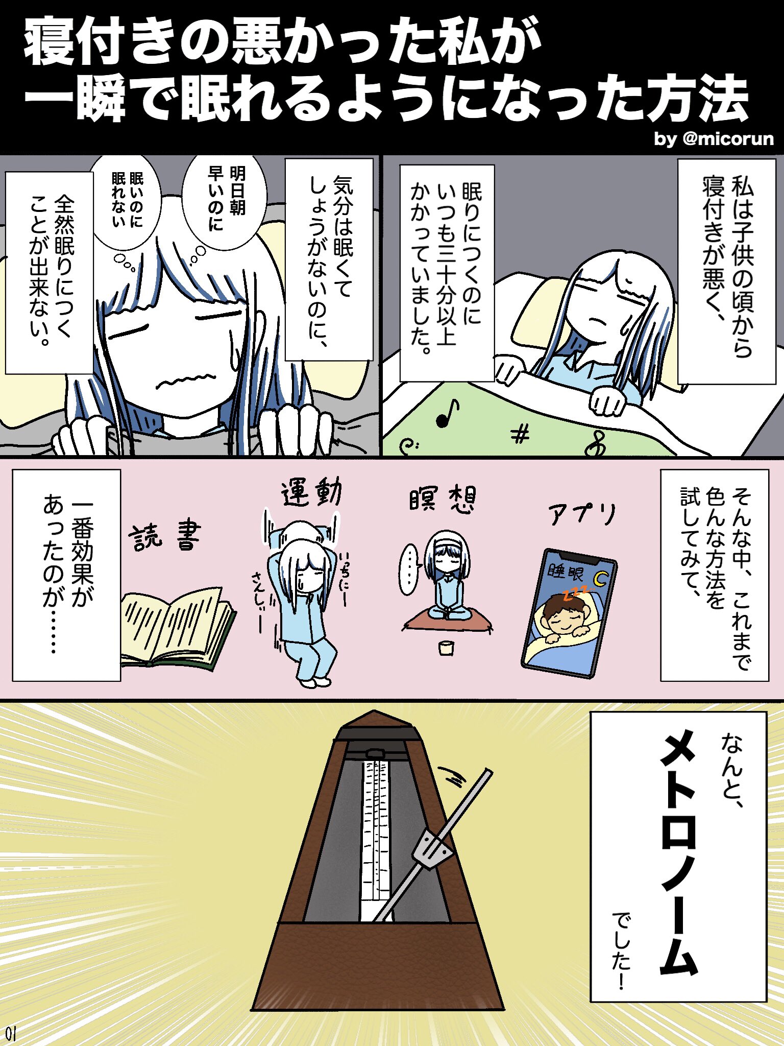 @micorun 寝付き悪いと思ってたのでやってみた所10分位で寝れてしまった笑。ありがとうございました( ³ω³ )これからもマンガ楽しみにしてます。
