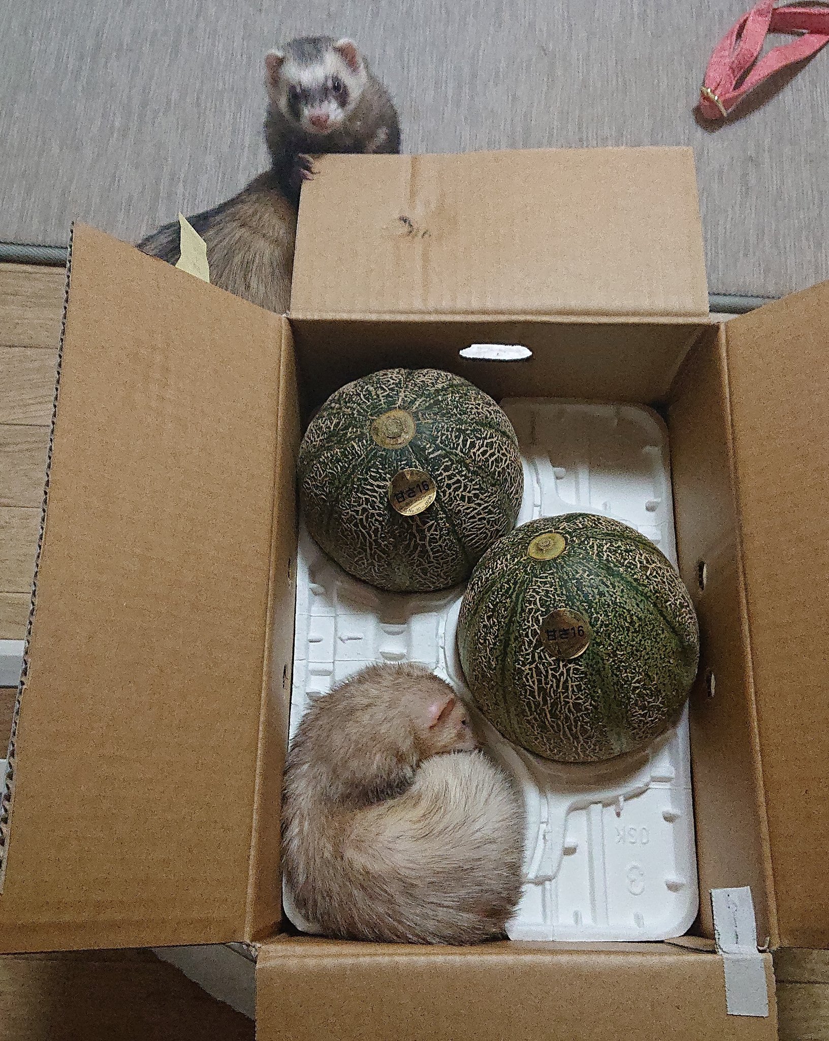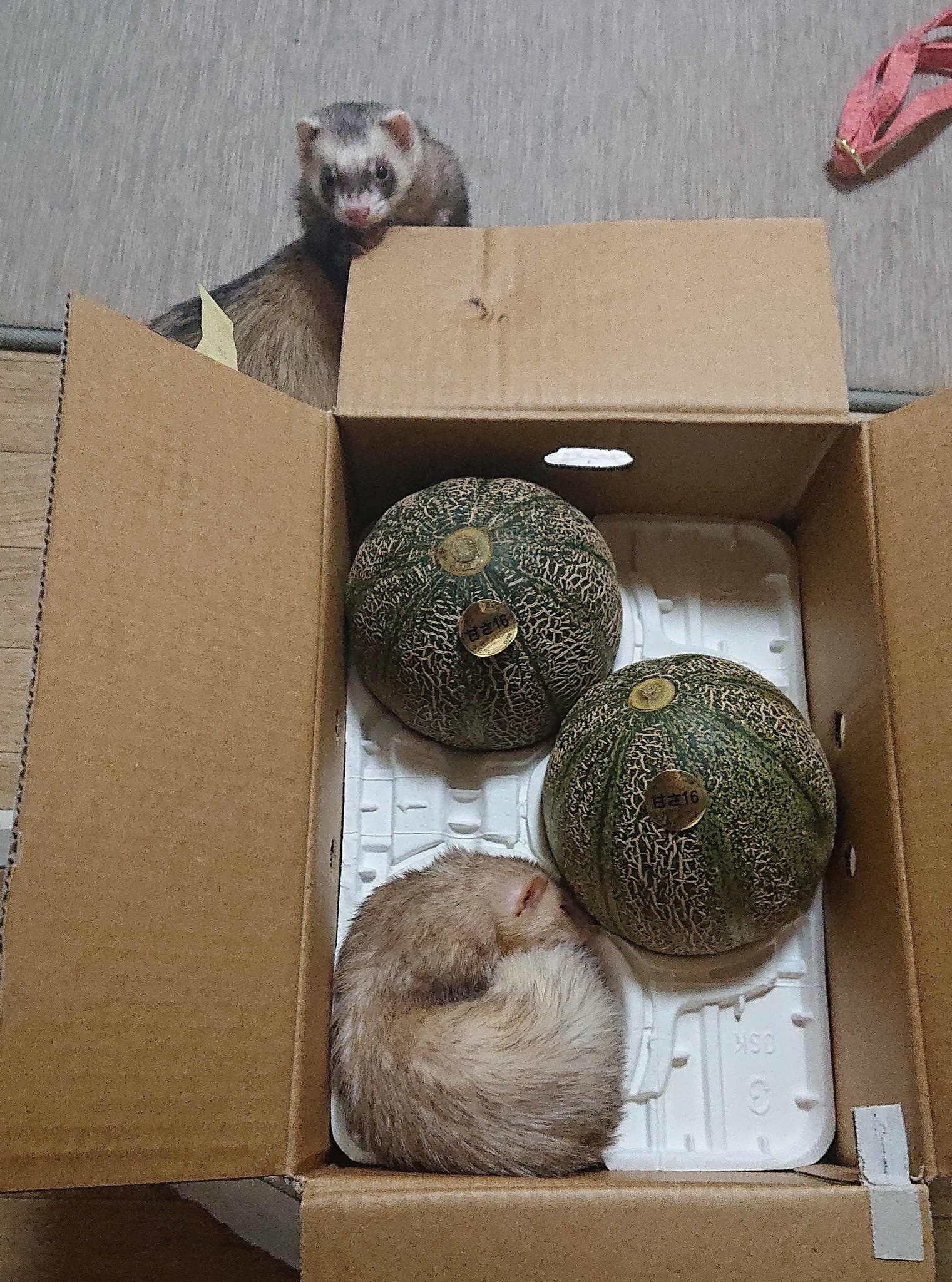 お中元でメロンを頂いたのだけれど、一玉取り出してご近所さんにお裾分けして戻ってきたらとんでもなく可愛い替え玉入ってた。 https://t.co/uqHHv427oa