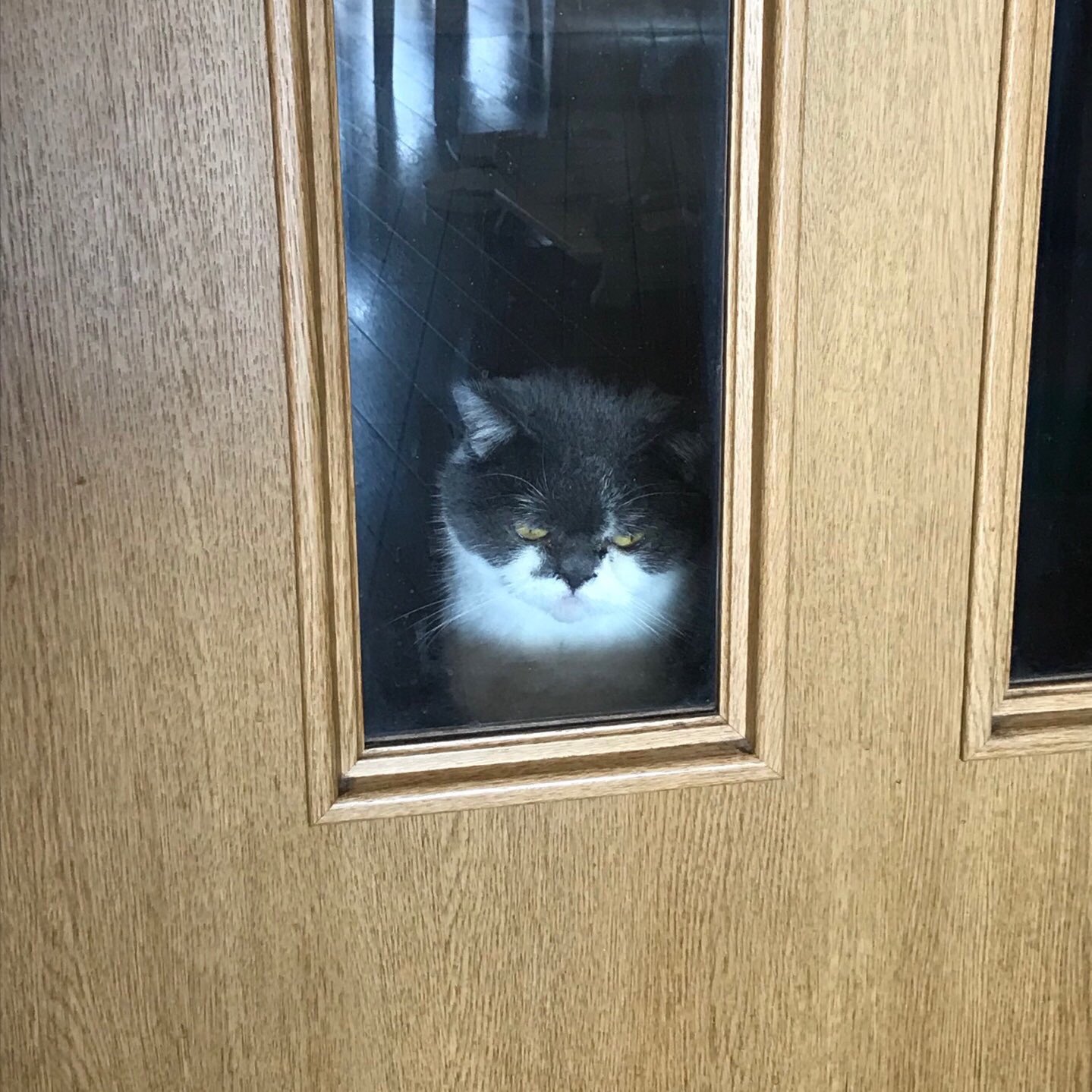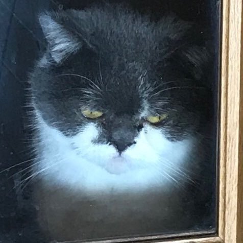 @jirosan77 後ろを振り返ると扉のガラスに猫の顔が映るんですよ こわいな〜こわいな〜ずっとこちらを覗いてるんですこの猫は何か伝えたいんだと思います
