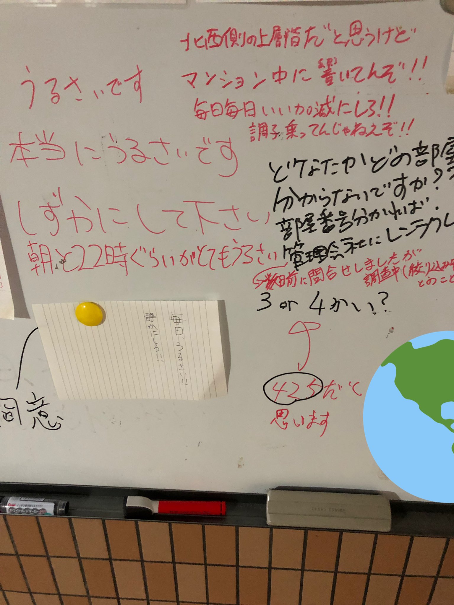騒音問題が起きているマンションで謎の連帯感。ガス抜きの役割も果たしていそうですが、賃貸の下見に来た人からすれば大きなマイナスポイントですねw