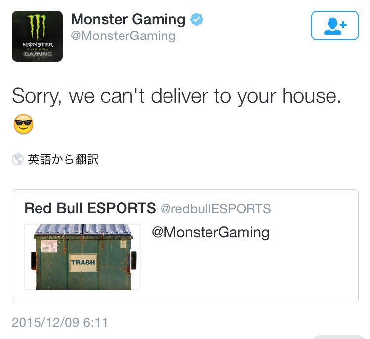 @fight_onigiri モンスター公式「このモンスターどこに運べばいい?」レッドブル公式「ゴミ入れに捨てとけ」モンスター公式「あぁ、お前の家か。運べそうにねぇな」