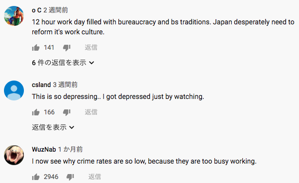日本のサラリーマンに密着、という趣旨のYouTube動画を観た海外の反応が最高。「観てるだけで鬱になる」「人口が減っているのも納得いく」「治安が良いのはこいつら働きすぎてて犯罪を犯す暇すらないんだな」 https://t.co/SA28K0uek6