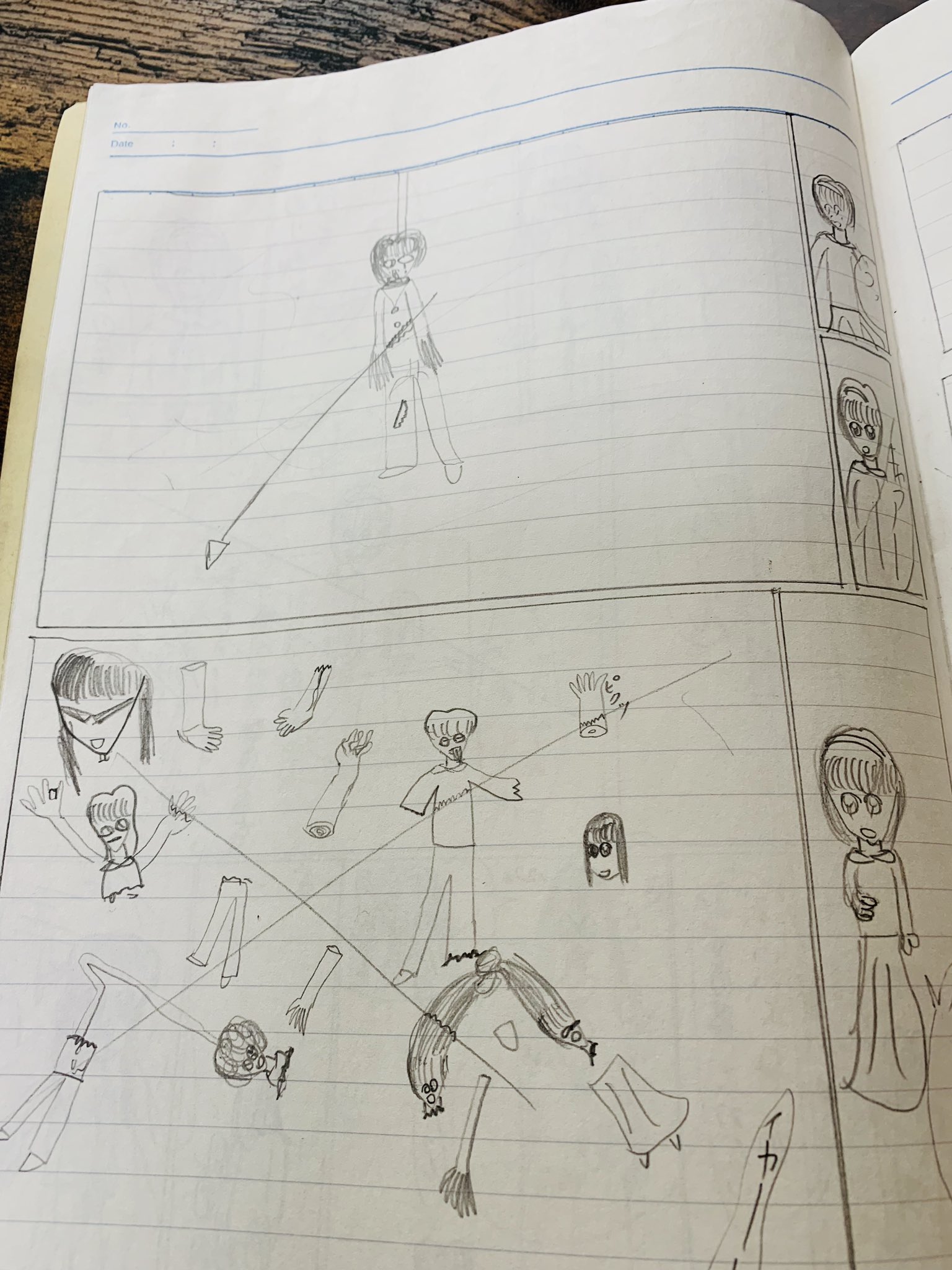 @holy_yell0525 こんばんわ!なかなかな内容ですね…w拝見して、私しかいない教室で「ふっっっww……」という声が響いてしまいましたwしかしながら本当に小学生の頃に書かれたのですか…?!発想力も、画力も、表現力も、小学生が書いたとは思えないです…すごい…(?)