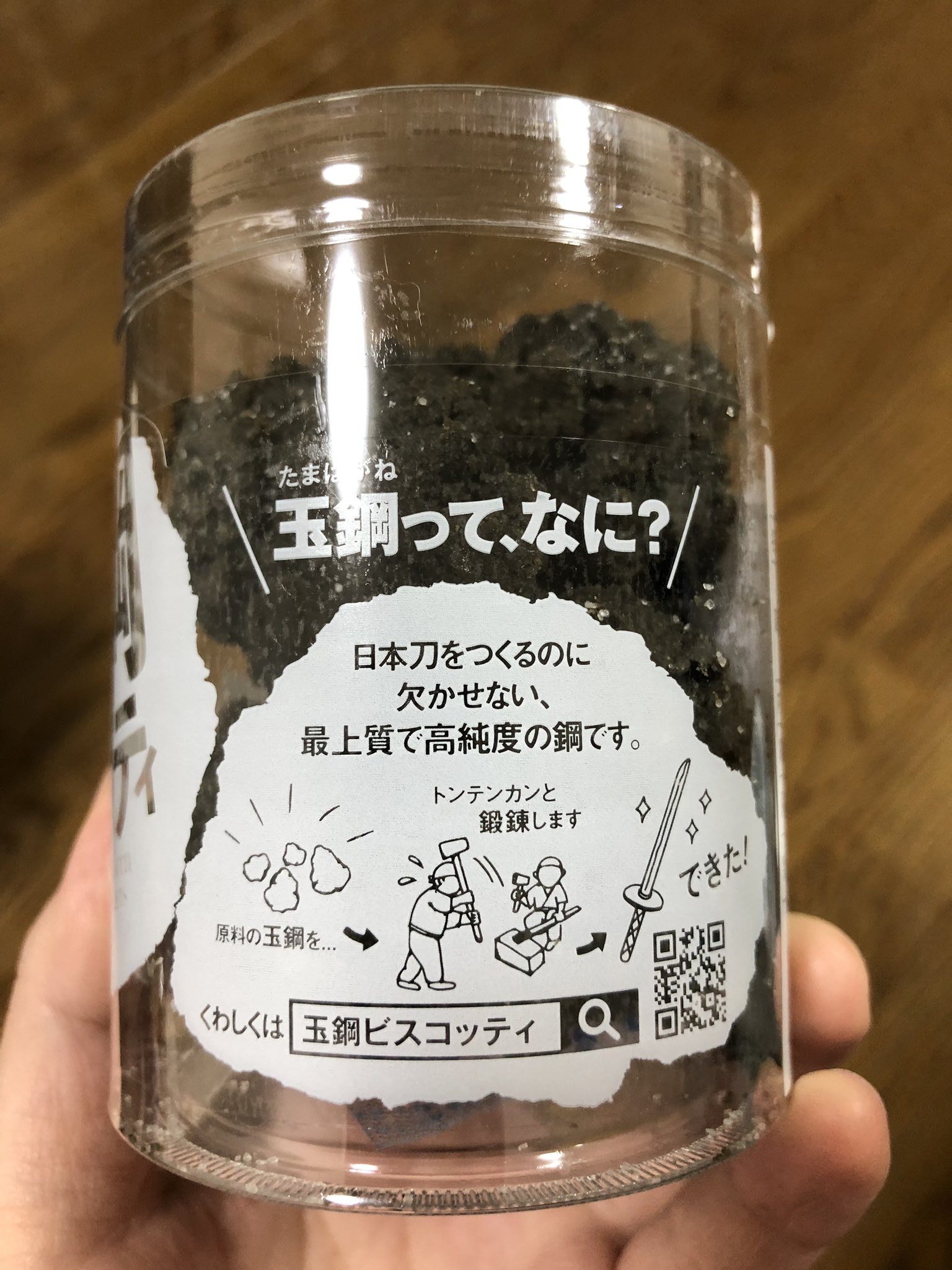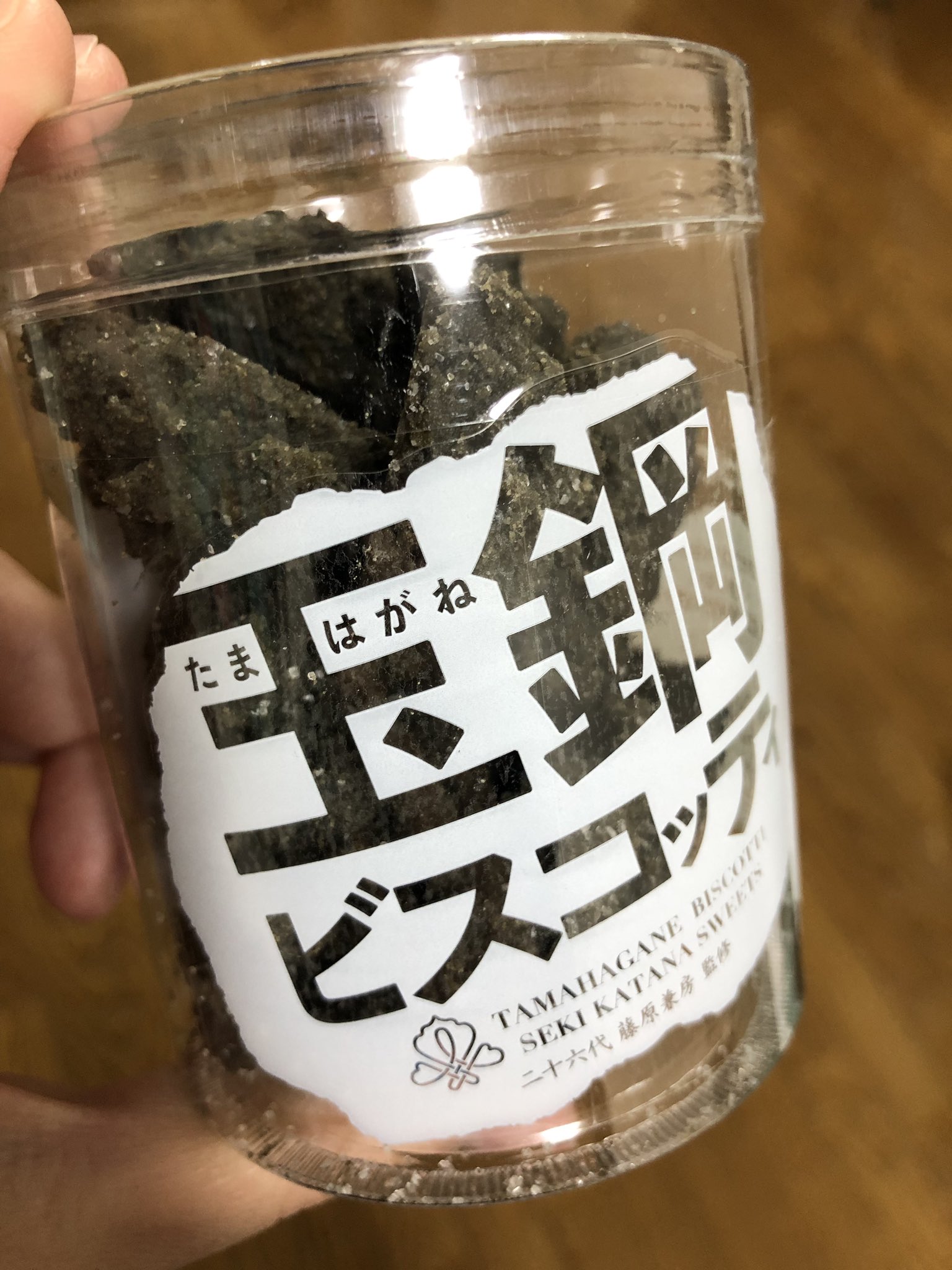 両国の刀剣博物館で売ってた「玉鋼ビスコッティ」が衝撃的…どうみても食品の見た目じゃない…材料読んでも金属味しか想像できない。しかも材料の米粉は兼元や兼定の美濃伝の本拠地、岐阜県関市というこだわりっぷり!明日のおやつにしよう… https://t.co/p5BjTaKLiR