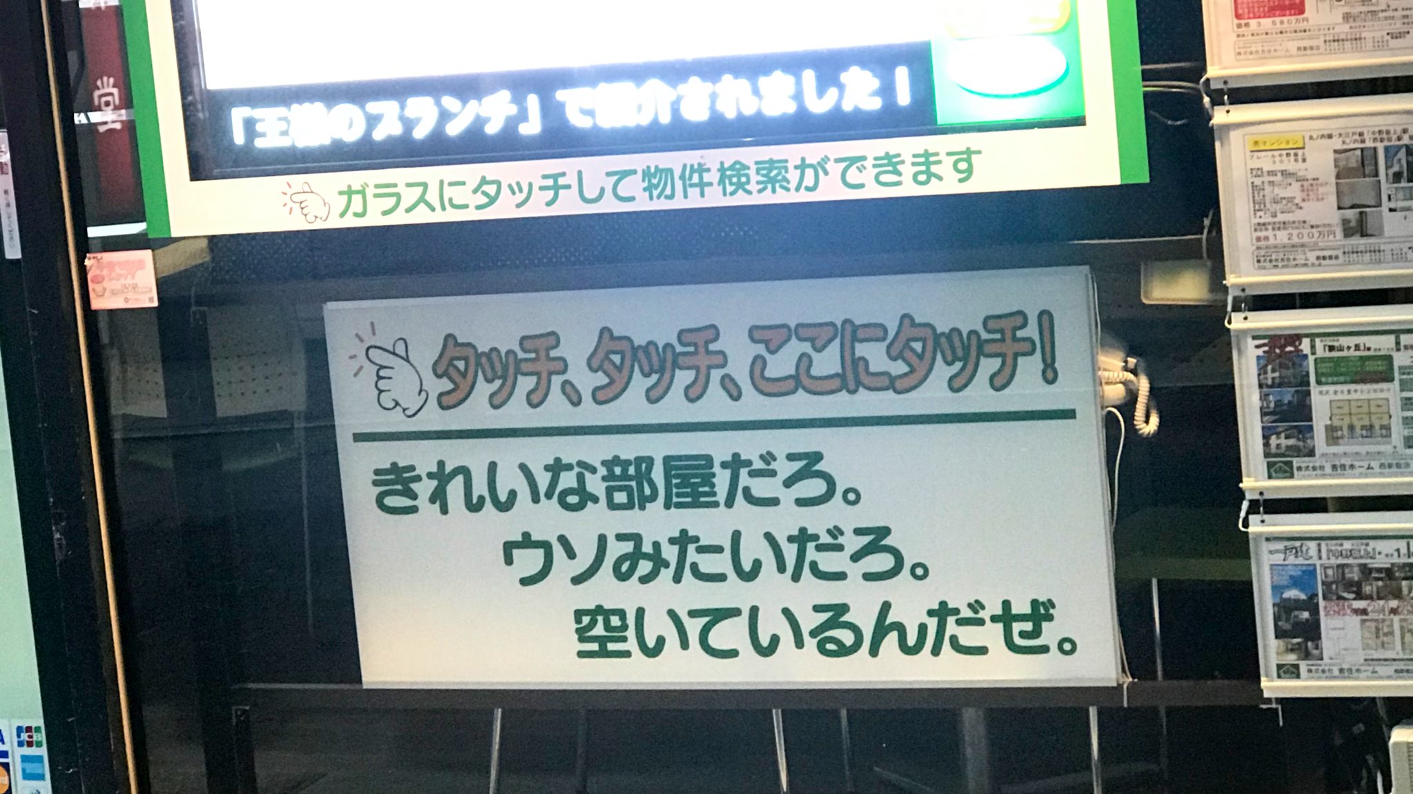 見かけた不動産屋の案内タッチスクリーン。思わず1秒呼吸を止めてしまったよ星屑ロンリネス。 https://t.co/80OrKBtSRS