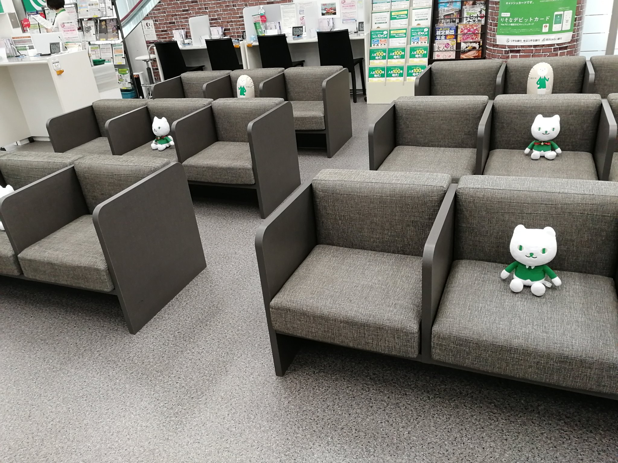 @maosan777 @hama0123456 確かに(ΦωΦ)!互い違いに座った方が、効果ありそうですね。ただ行員さんも苦肉の策で・・と仰っていて、1番後ろの席は立ったままのりそにゃが席を守っていたので、この置き方じゃないとりそにゃ職員の数が足りなかったのかもです😅