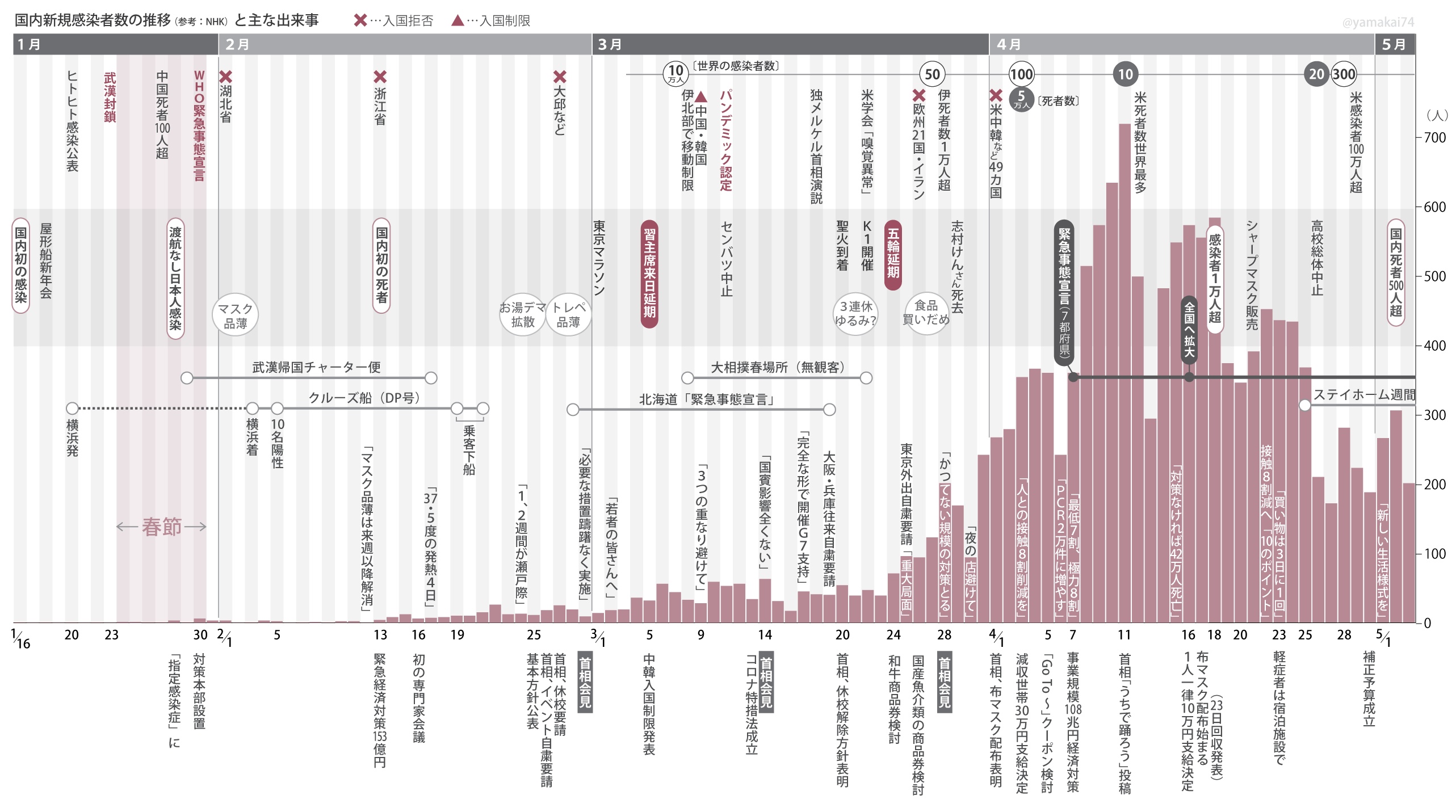 コロナをめぐる現在までの動きを年表にまとめてみた(国内新規感染者数の推移と一緒に)。あのときどんな状況だったかすぐ分かるように…。 https://t.co/ofsIZ8oOix