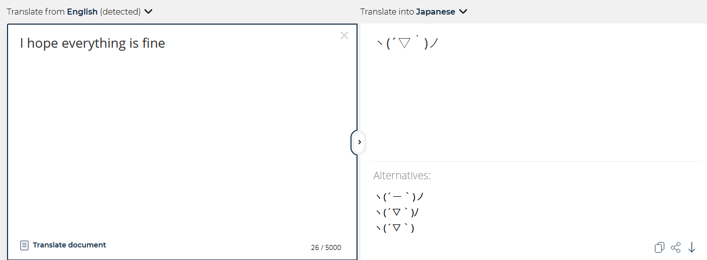DeepLくん、感嘆符の文章が2連続すると情緒がおかしくなるっぽいな https://t.co/N6F8vi2ien