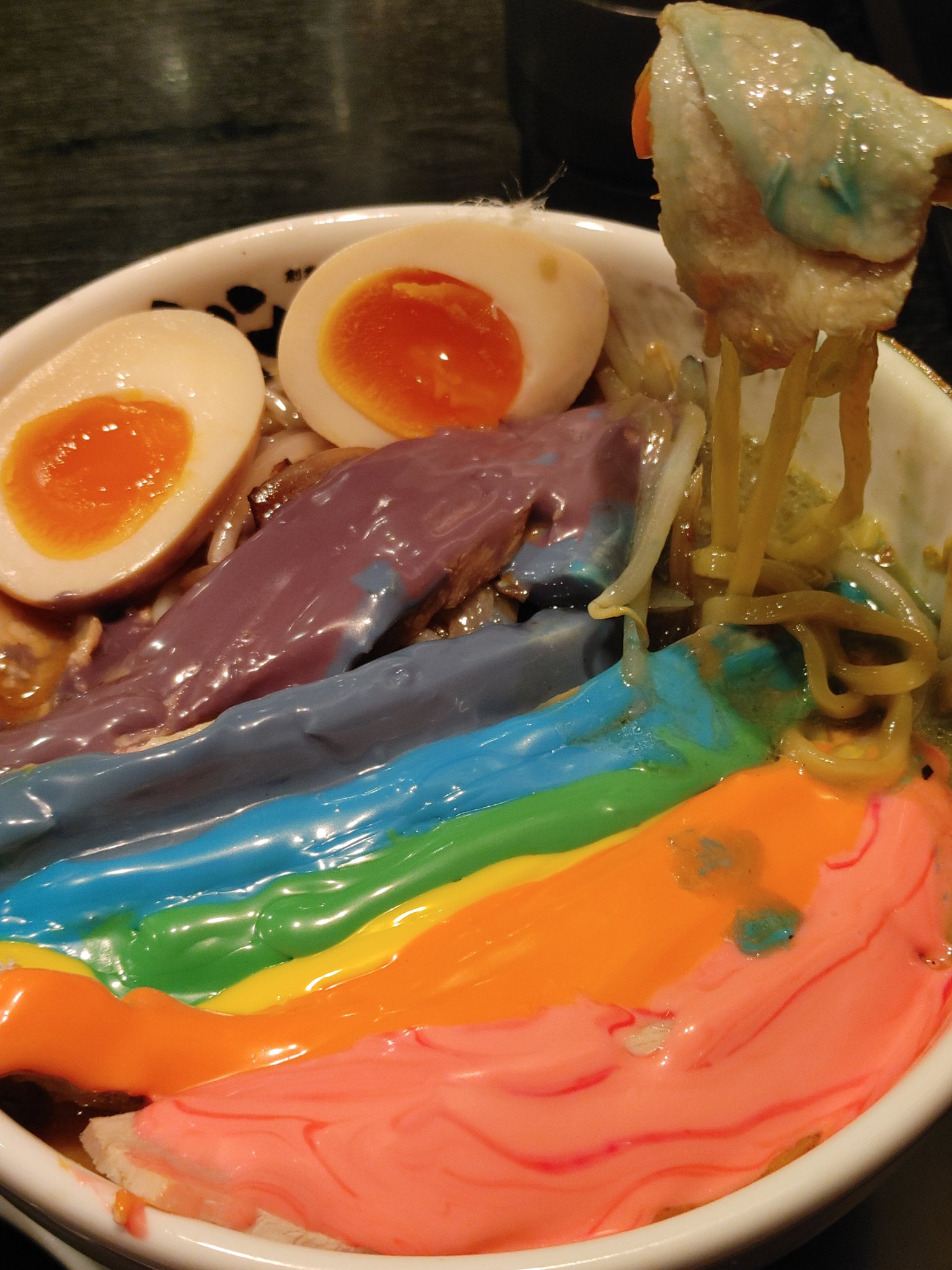 というわけでどさん子のハッピーレインボーラーメン実食してきたよ記事で見たようには麺にチーズが絡まなくて残念チーズが混ざるとスープが黒っぽくなる、みんな大好き色の三原色の法則だねいかにもゲテモノな見た目、さぞかし不味そうと思うじゃん?ところが色に目を瞑れば美味しい https://t.co/6XRHOxVBKq
