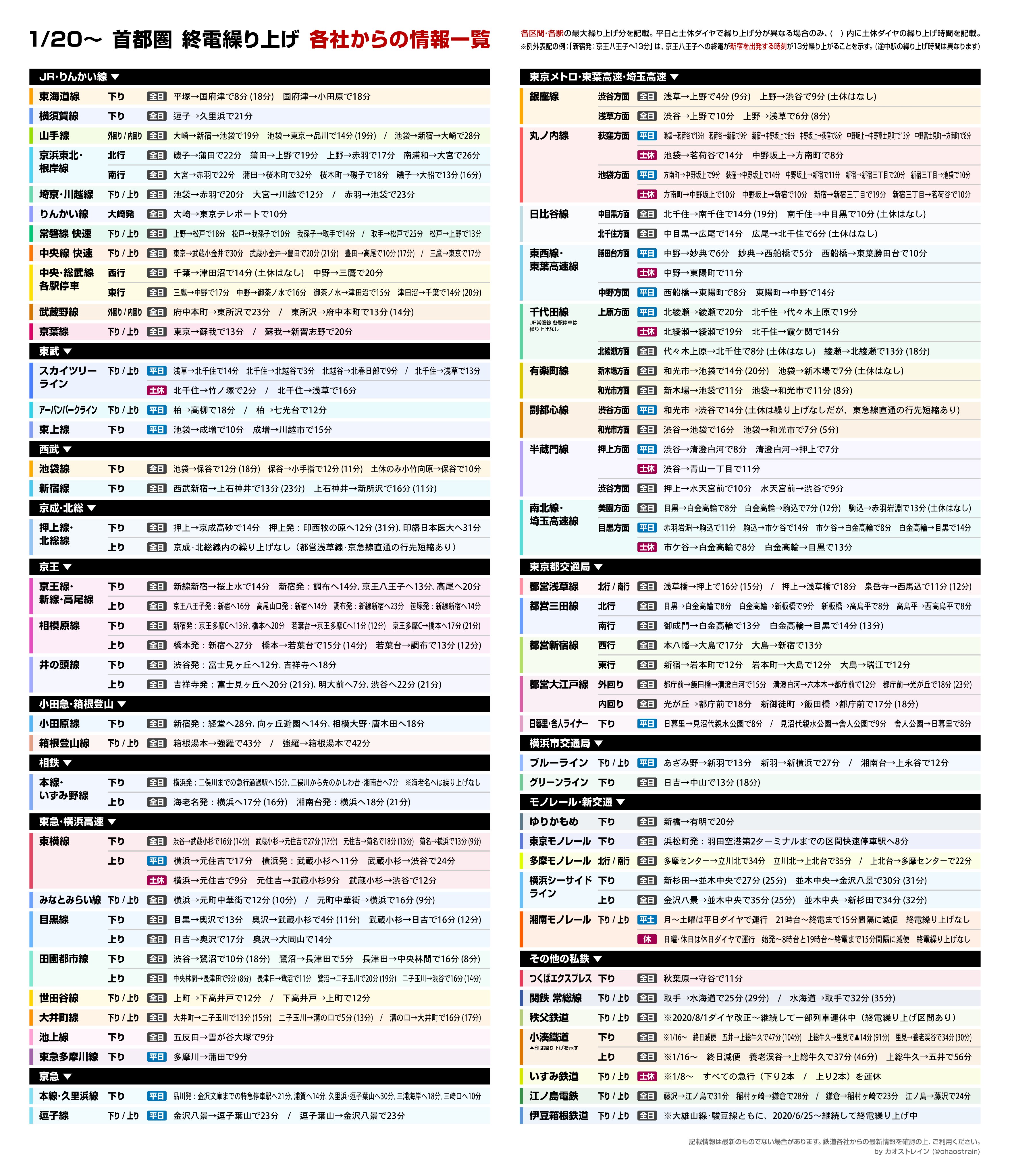 あす1月20日から、首都圏のJR・私鉄・地下鉄など各線で緊急事態宣言に伴う終電繰り上げが行われるので、情報をまとめてみました。深夜までお仕事の方などは十分ご注意ください。 https://t.co/KHOlhEx5tf