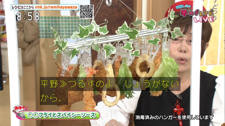 『つるすのよ、しょうがないから。』しょうがないからねそして料理番組では一生見ないであろうテロップ消毒済みのハンガーを使用しています#平野レミの早わざレシピ https://t.co/h3G0TIlgrC