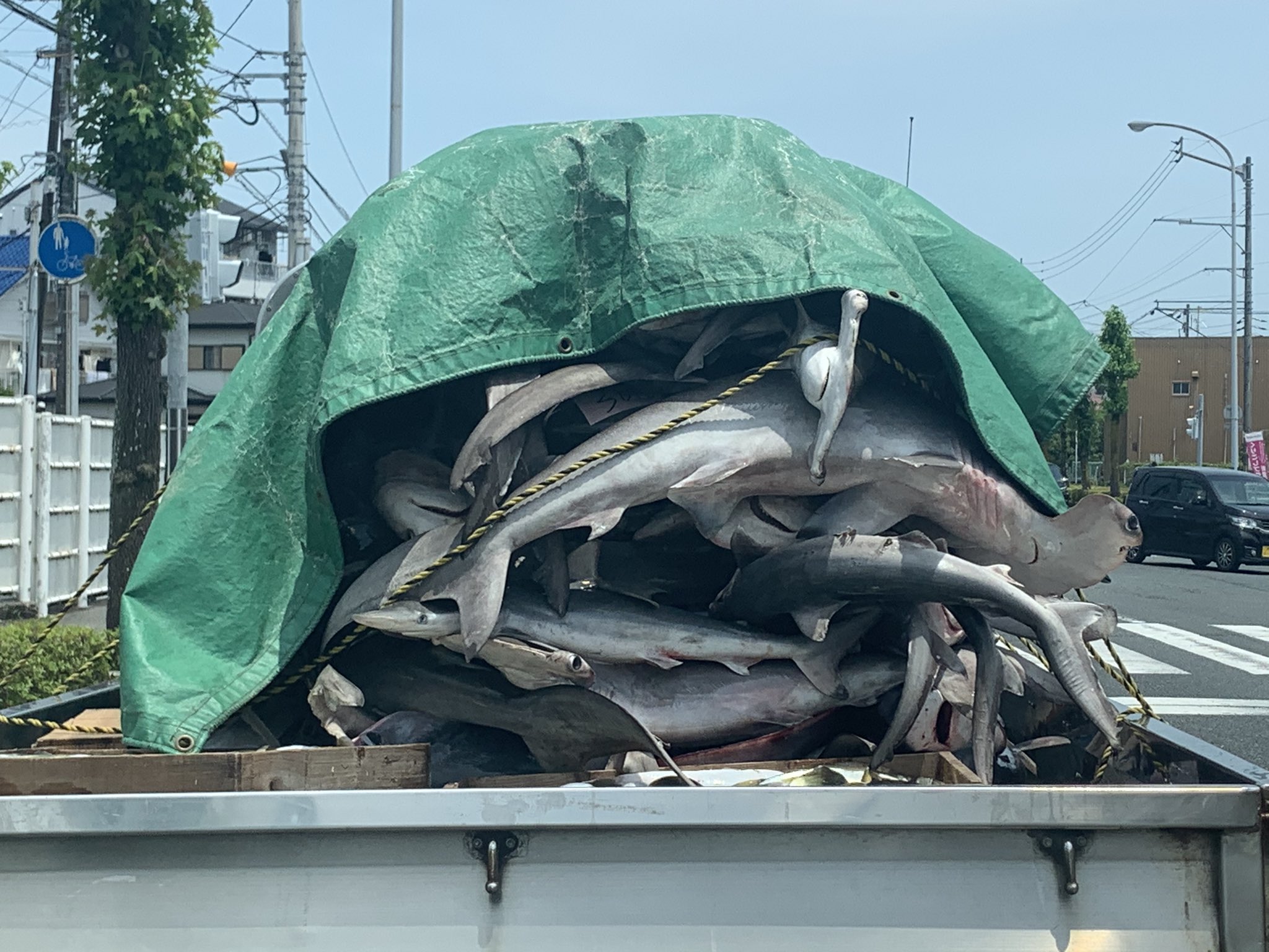 おお!!サメ満載のトラックと、すれ違った〜と思ったら、先の道路に落ちてる(^_^;) https://t.co/nfBsejOx2L