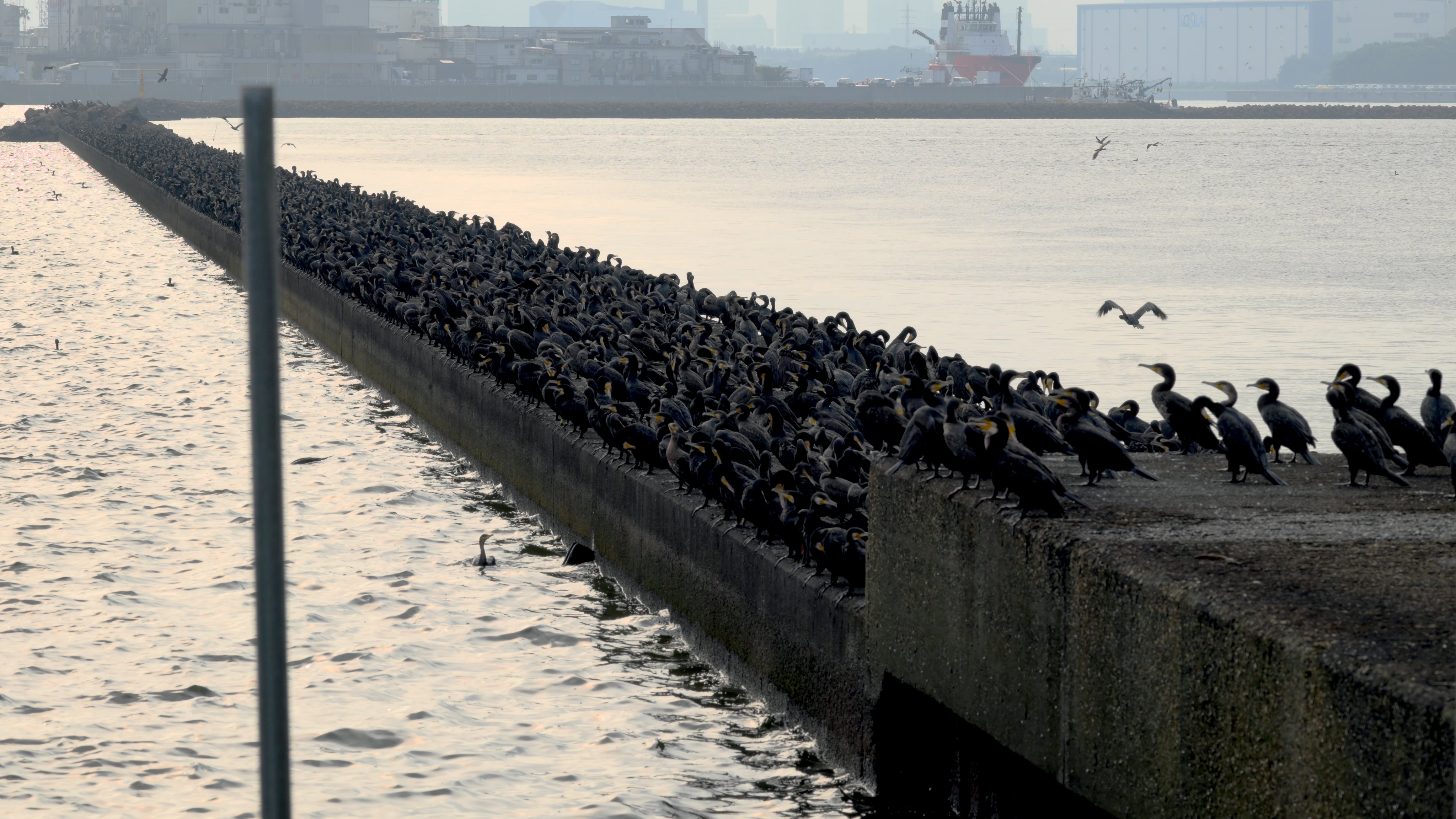 @mako8ys 鵜と鵜の間にコンクリートがある。。でも、これだけの人数をまかなえる魚が足元の海にあるんですね!