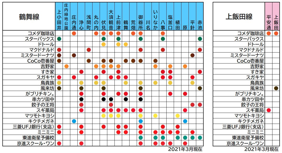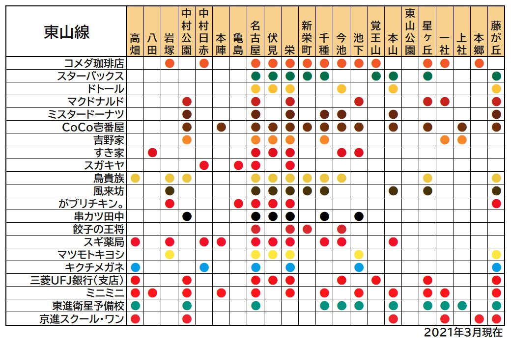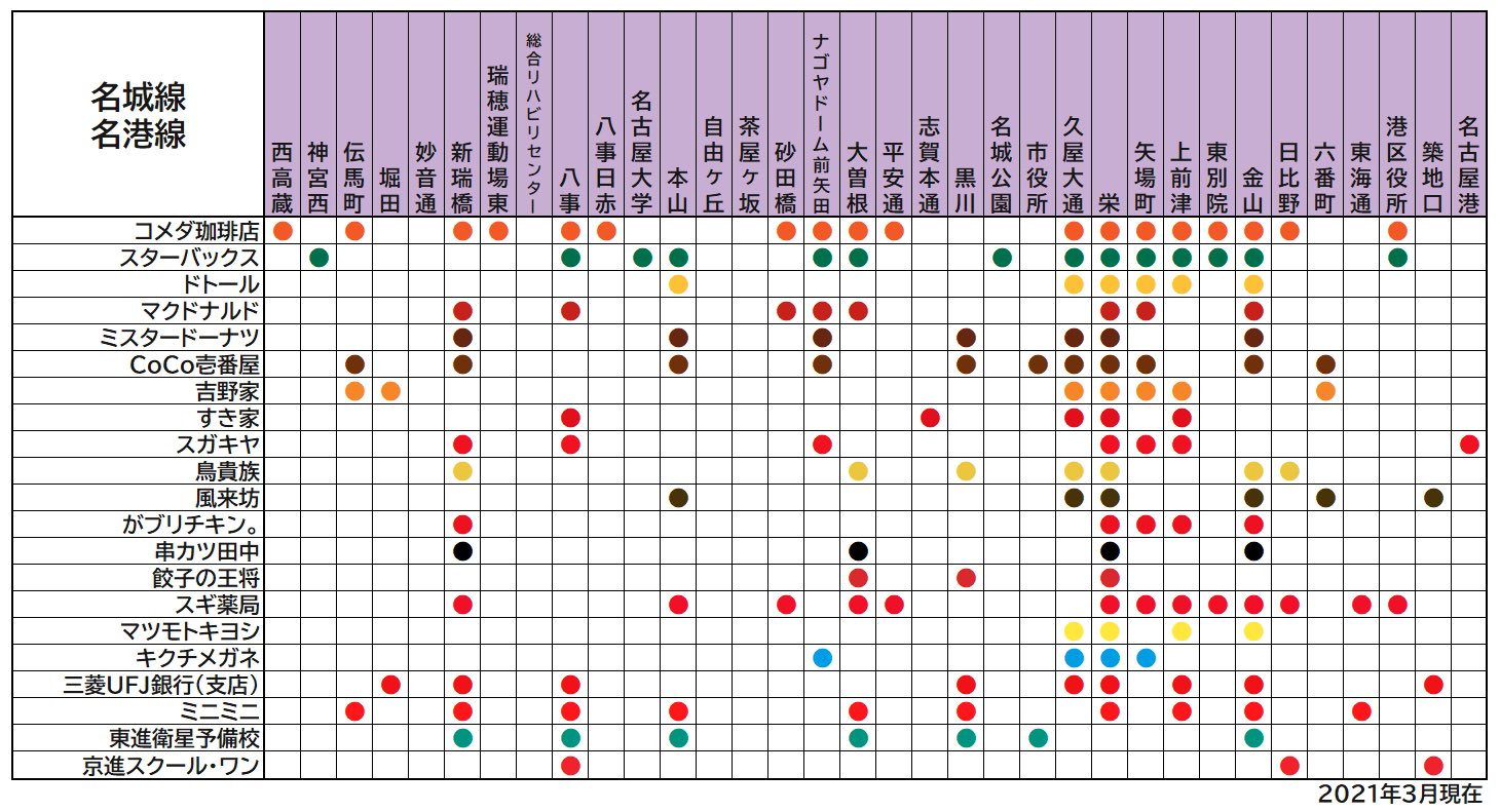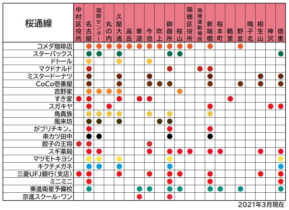 名古屋の地下鉄各駅周辺にどんなチェーン店が立地しているかを表にまとめてみた。こうして見ると、新瑞橋・御器所・中村公園・浄心・黒川等が地域の拠点として機能しているのがよくわかるし、いつも閑散として見える東山線の西側区間も意外と充実していることがわかる。 https://t.co/XfCA6whC07