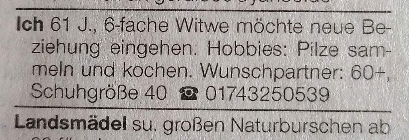 「61歳の女性。6回も旦那に死なれては恋人募集。趣味はキノコ狩りとキノコ料理。」と新聞の個人広告。乗る気がない男性わかる気がする。 https://t.co/b4uoF8SkG3