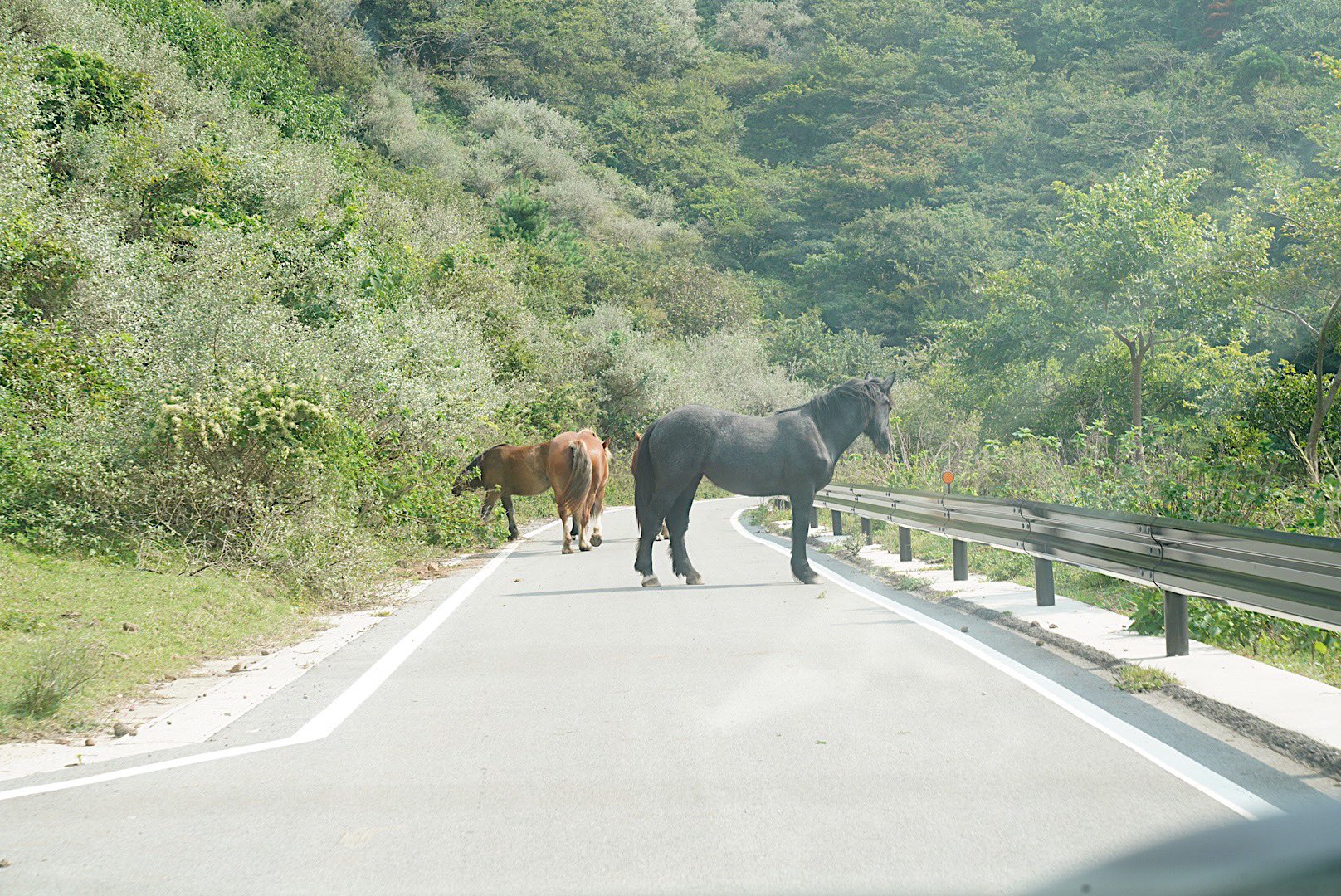 車で山登ってたら突然大きな馬たちが道路で平和に草食べてた。怯えるヒトの空気を察して退いてくれる馬…優しい。 https://t.co/Xoy23dgc4v