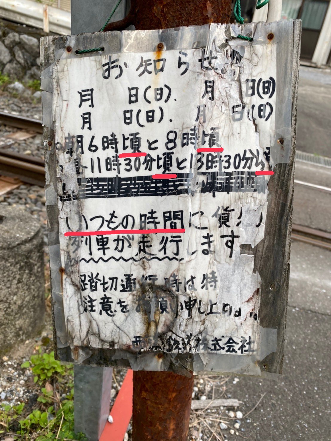 坪尻の横の第四種踏切もこんなこと書いてあったなー。さすがにいつもの時間はないけど。。。 https://t.co/s1kq3KuSdG