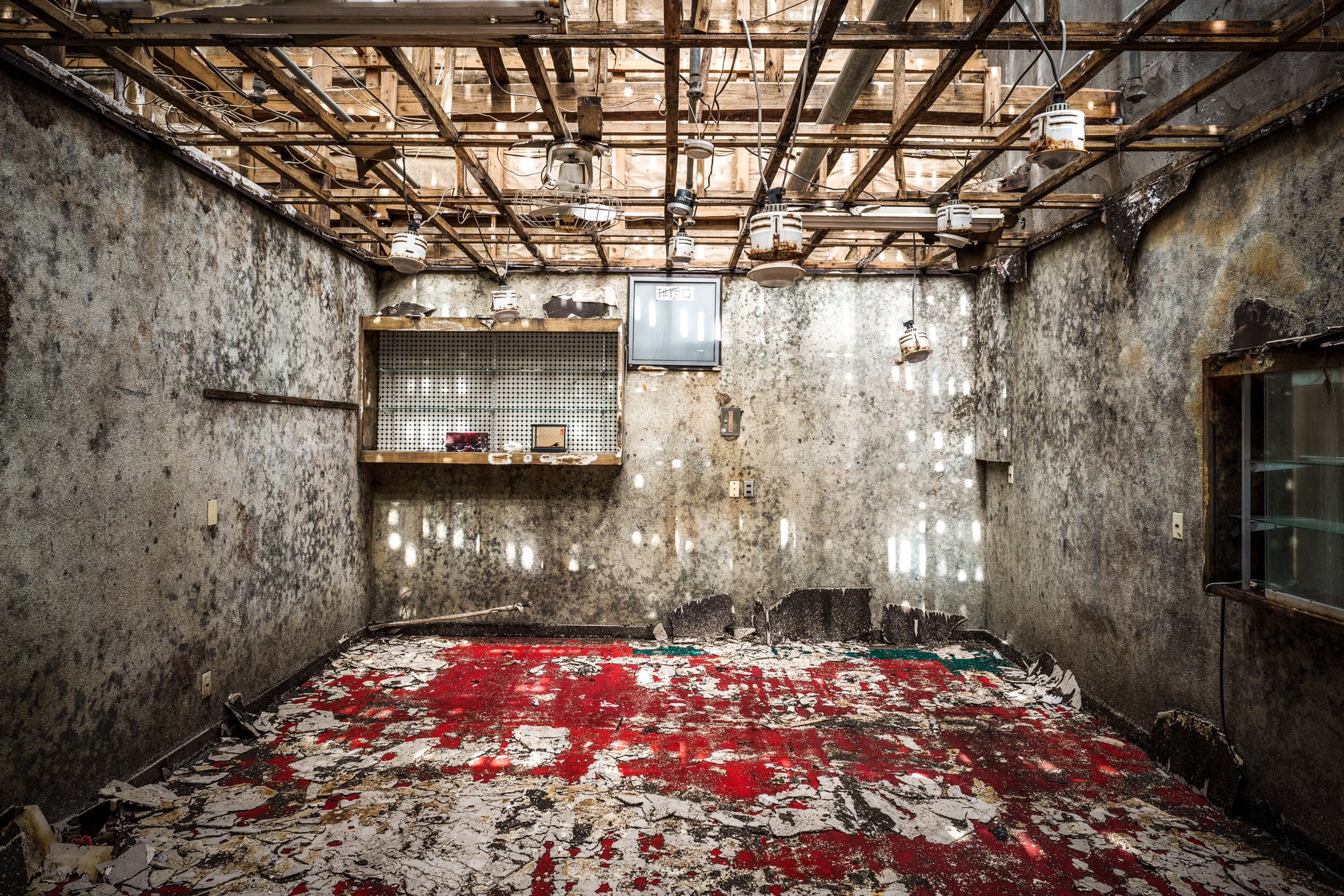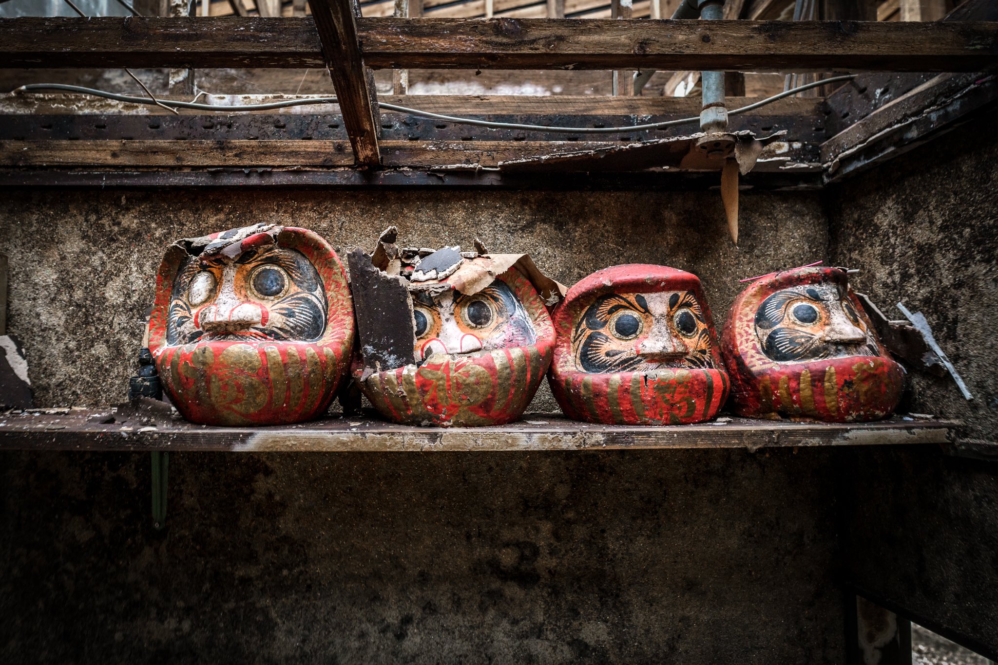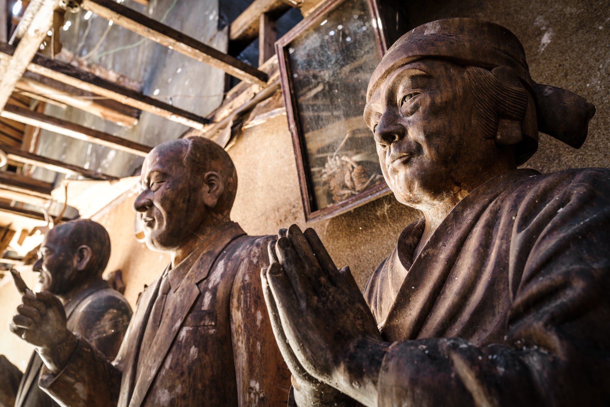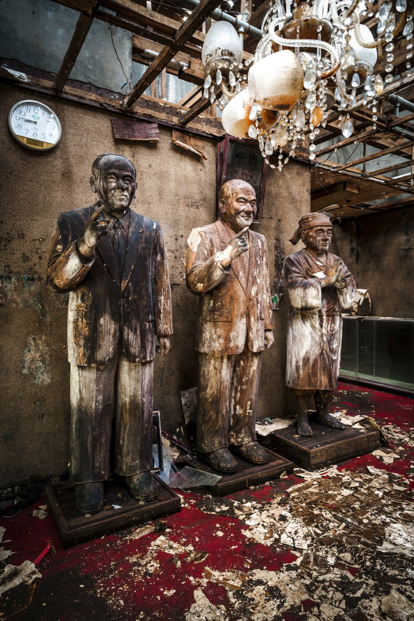廃旅館に佇む、謎の教祖像三人組。これよりデスゲームが開始されそうなヤバめな空気感が立ち込める。 https://t.co/9Mv2uKxNLr