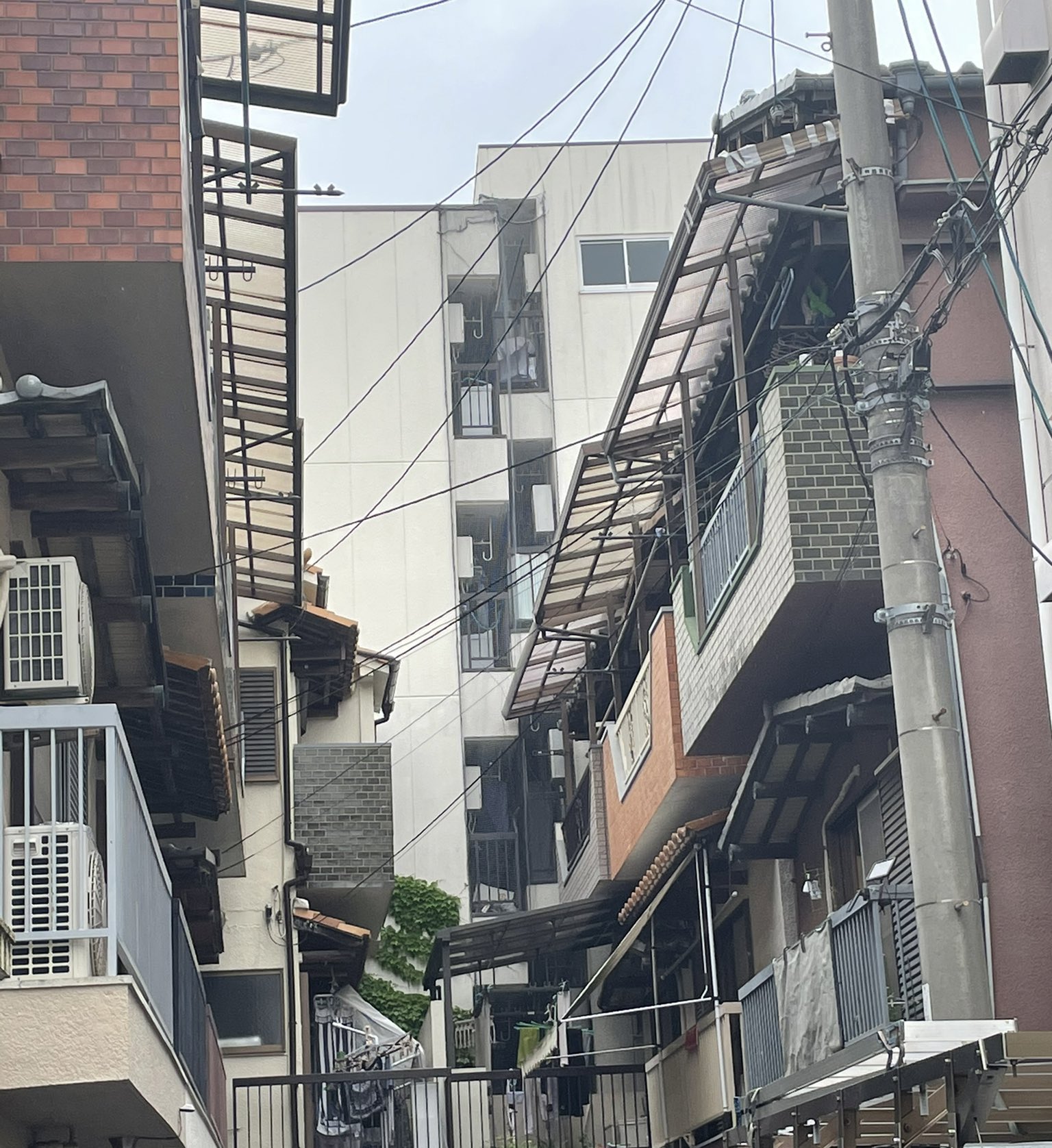 【大阪市城東区の八の字マンション】2棟がお互いピサの斜塔みたいに傾いてごっつんこしてるマンション。前から見たらそんなだけど、裏から見るとバルコニーが刺さってる。なんなら完全に挿◯ってる。よいこのみんなはバルコニーがディ◯プキスしてるとか言ったらダメだぞ。#クソ物件オブザイヤー2021 https://t.co/KFrXsdVxS8