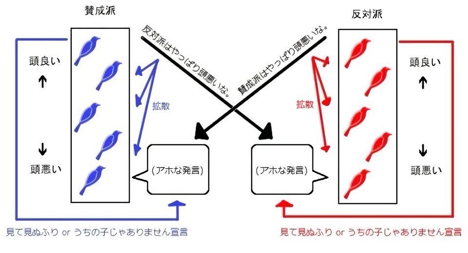 @fumiyas うーん。双方の「頭いいポジ」にいる方々ですが、頭いいのなら相手方にも有識者がいる事は想像ついてるはずでは。個別に発言へツッコミする事はあれど「〜派」と一括りにして「アホ(派)」扱いしない気がします頭がいいポジの方も実は頭良くはない、もしくは図が不適切かと思われます。