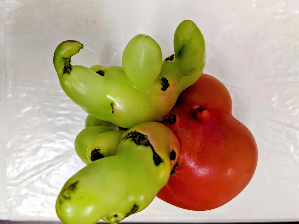 どうしてこういうトマトができるのか?というお問い合わせがあったので再掲ですが載せます。見た目怖いですが緑の部分を切り落とせば問題なく食べられる規格外トマト。今年から名前を「とまとの輝き」にしたら直売所でお客さんが買ってくれるようになりました。 https://t.co/OXSuVM6P4f