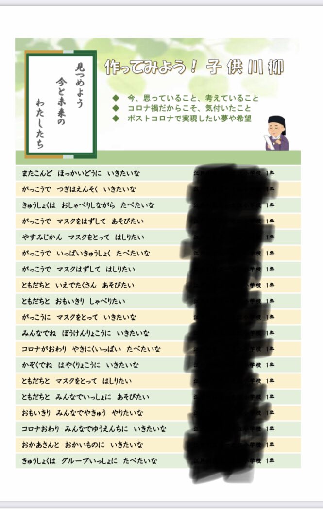 小学校、東京都教育委員会に子供川柳を出したらしいんだがその作品が泣けるものばかり😭😭😭😭😭早くコロナ騒動終わらせようよ!いつまで子どもに我慢させるんだ! https://t.co/75tnNWn7s5