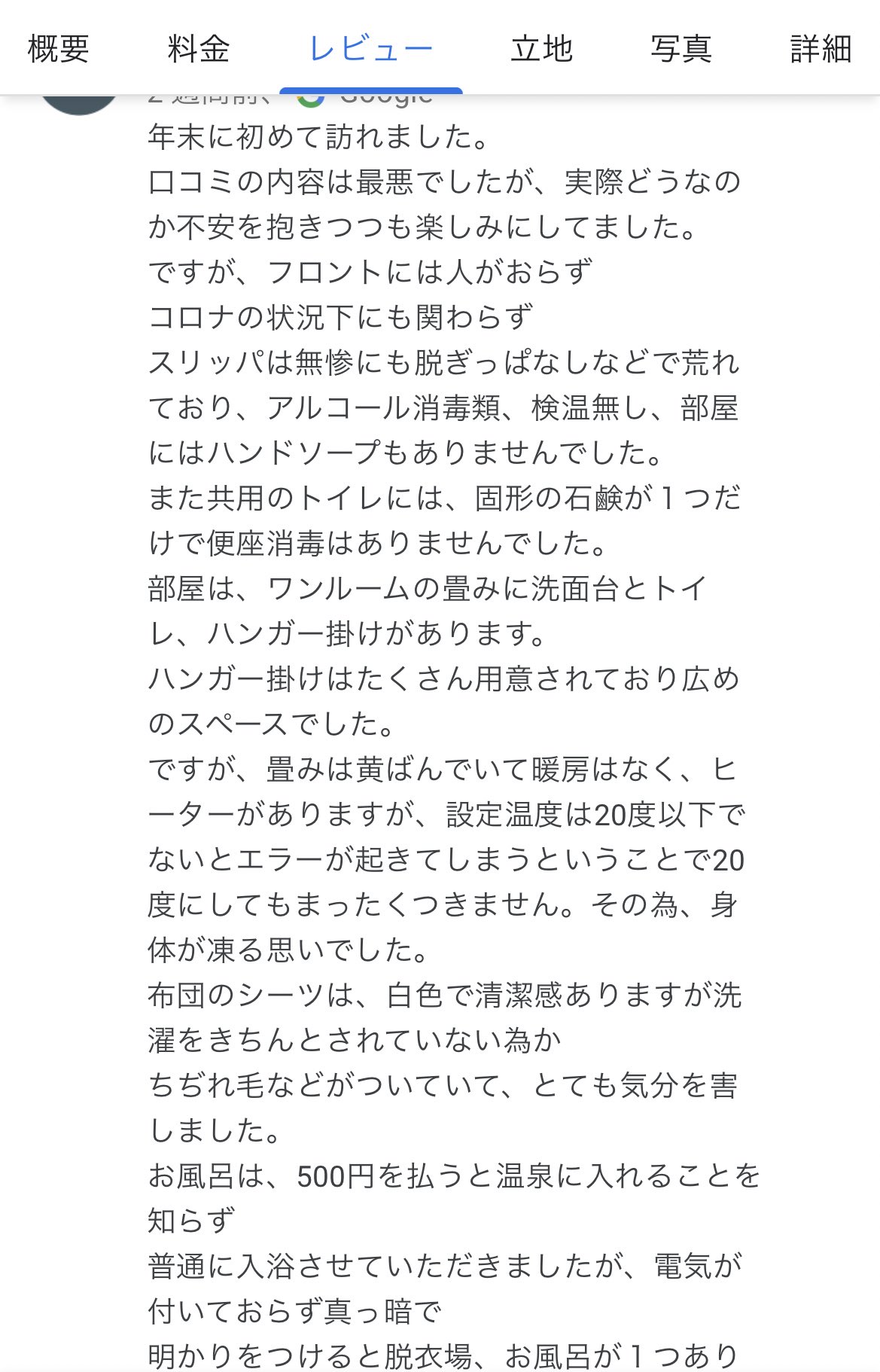 トータルで、まあこのレビューほどひどくは無かった。宿の人もタメ口のじいちゃんってだけでそんな高圧的だったりもしなかったし。飯も食えた。風呂はわからなかったけど近くの温泉に入るのがデフォっぽい感じだった。部屋は最近畳張り替えたのか綺麗で特に文句なし。⭐︎3レビュー投稿しようかな。