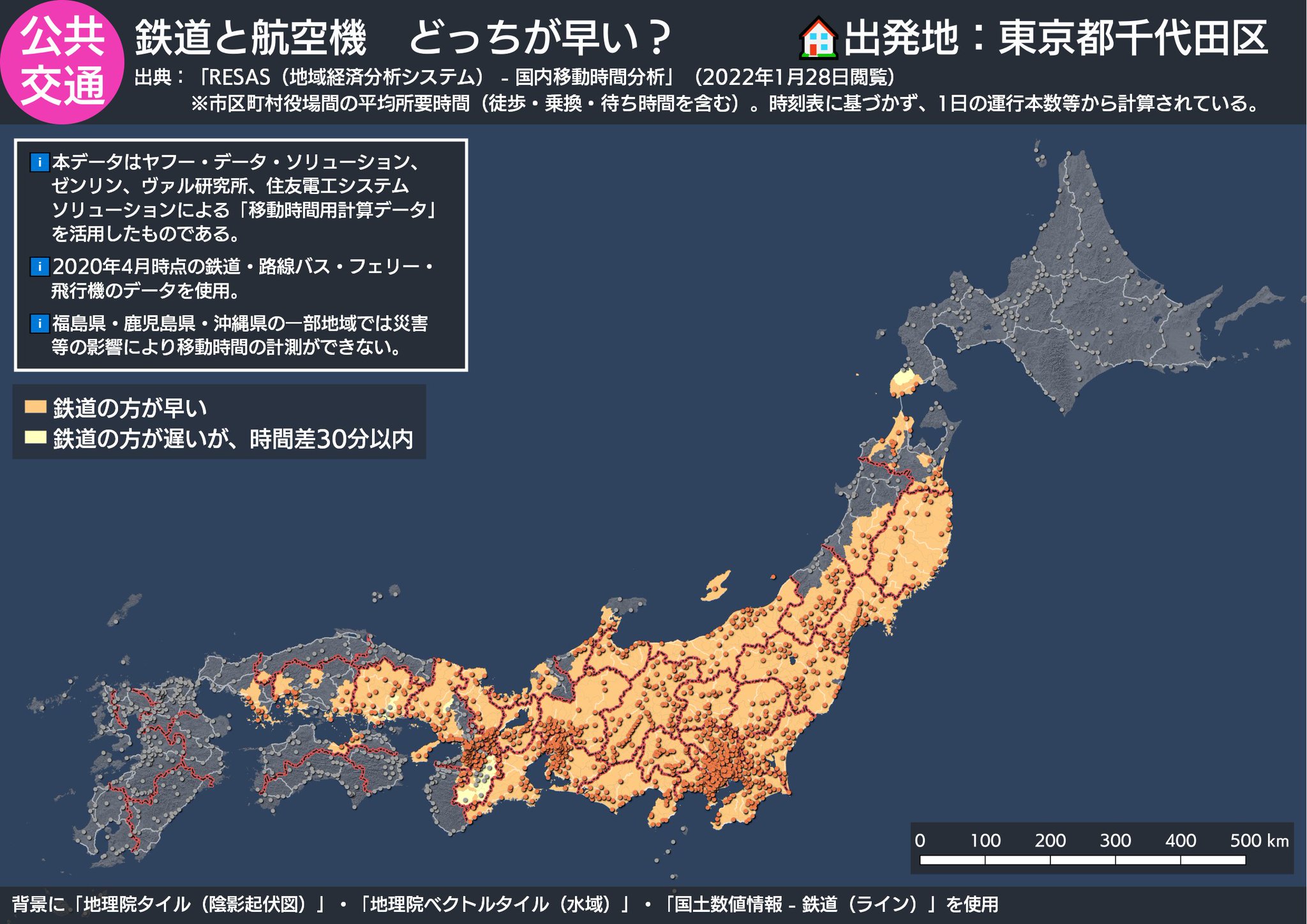 鉄道と航空、どちらの交通手段が早いのか比べてみた。まずは東京(千代田区)から。こうして見ると「4時間の壁」がよく分かる。北陸新幹線が延びた世界、四国新幹線が実現した世界を想像すると楽しくなってくる・・・ (・ㅅ・)。【出典】RESAS「国内移動時間分析」市区町村役場間の平均所要時間 https://t.co/ntckJOG1m5