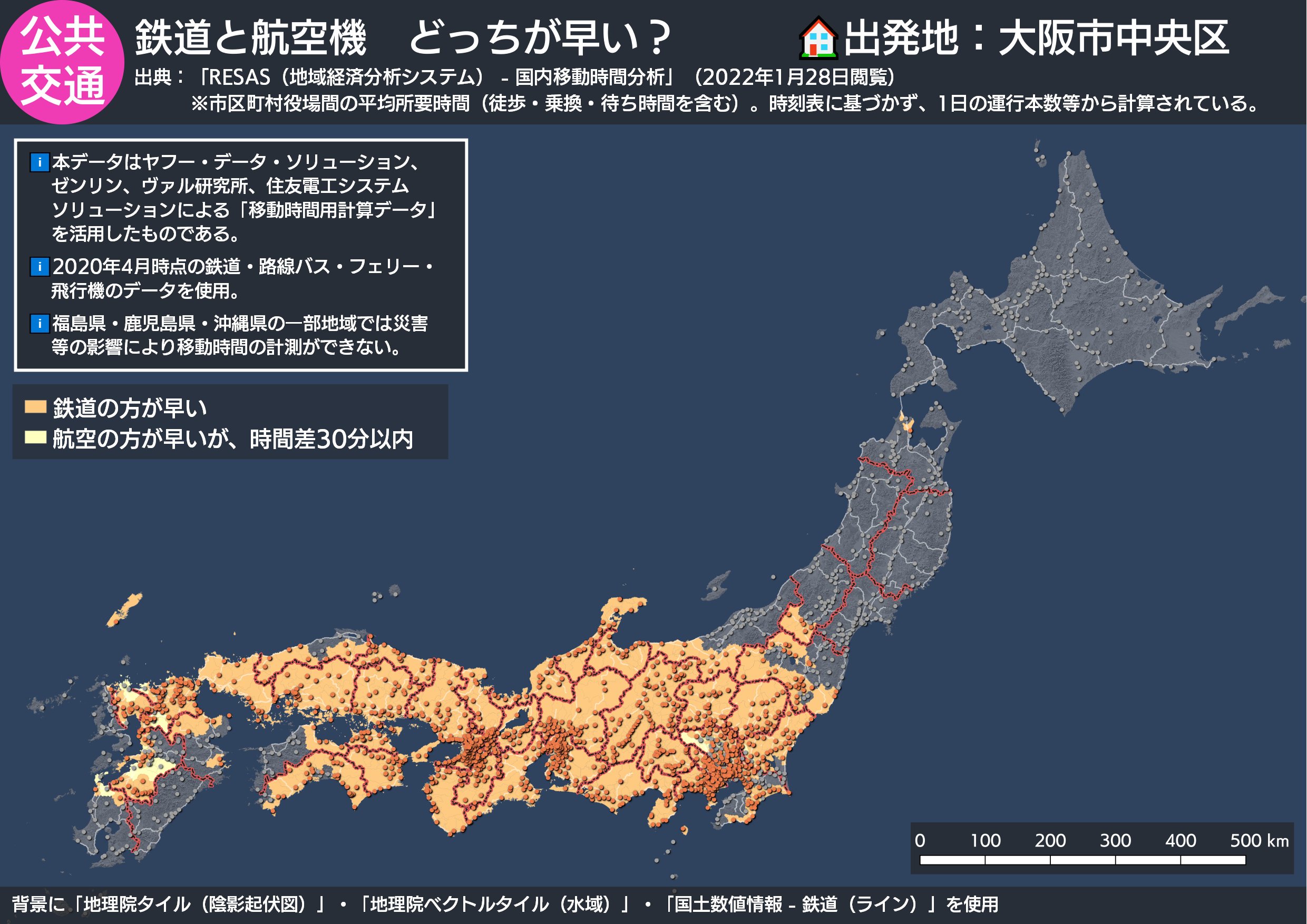 こちらは大阪。出発地は中央区役所(堺筋本町)九州新幹線の全面開業後、大阪府→熊本県の移動は鉄道が主流に(シェア3割→6割)。出雲や松山など、岡山駅で乗り換える地域は航空便の方が早いけど、実際の利用状況がどうなのかは気になるところ。 https://t.co/iJe7ZIcVNM
