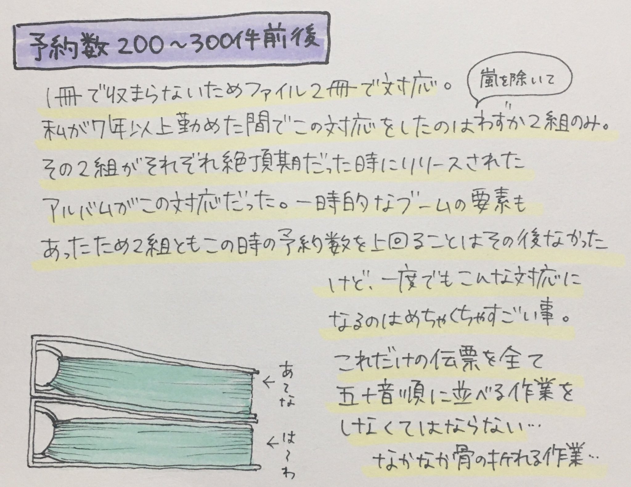 嵐のリリースが決まるとCD屋がまず乗り越えなければいけないのが情報解禁日初日。アルバム解禁日に実際に体験した恐怖の1日がこちら(※盛ってません)(小さい店舗だったので通常1日で20〜30件入れば十分多い方だけど、この時の嵐は1日で130件以上の予約があった…) https://t.co/WyJVoAB9YN