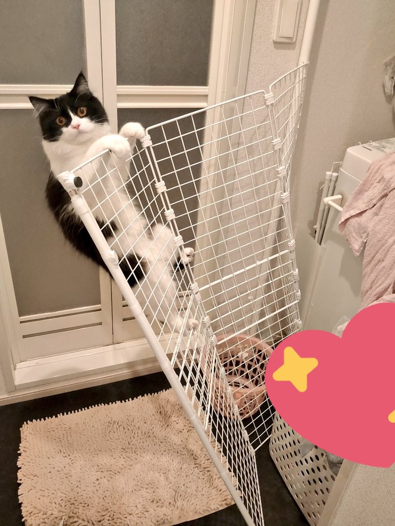 これは、洗濯機の周りで遊ぶのを辞めてほしくて私が昨日一生懸命設置した柵と、当たり前のようによじ登ってるネコチャン!!!! https://t.co/R95SABhyEt