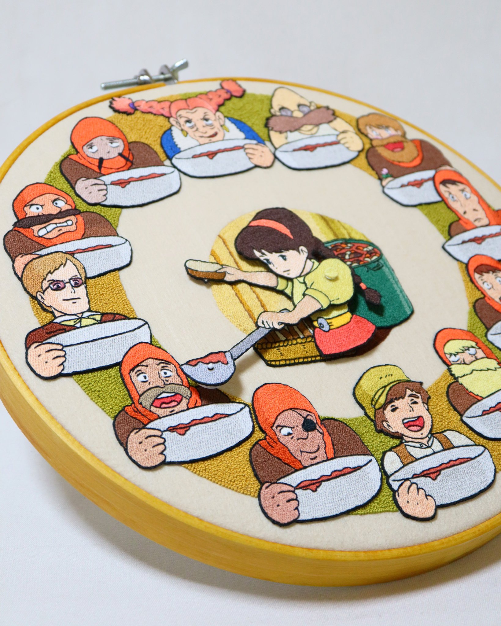 【ラピュタ】あるツイ民が刺繍で製作した「シータがドーラ一家にシチューを配り続ける時計」がシュールすぎると話題にw