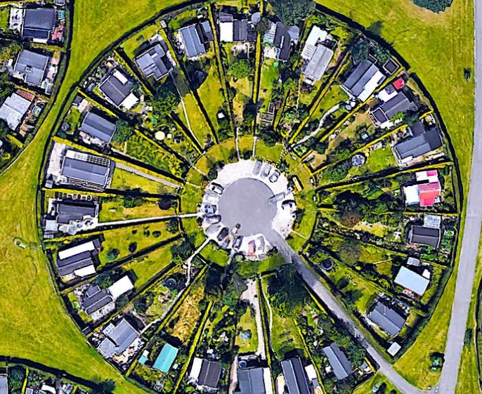 この楕円形の敷地にある家は小さく、コテージや小屋と言った方が適切でしょう。このプロジェクトに影響を受け、造園家エリック・マイジンドは 1960 年代半ばにコペンハーゲンの近くのブロンビューに、円形の庭園のコミュニティを設計しました (右上と右下の写真)。©Ben ter Mull, Roger C. Landivar https://t.co/wlCE5ioTBw
