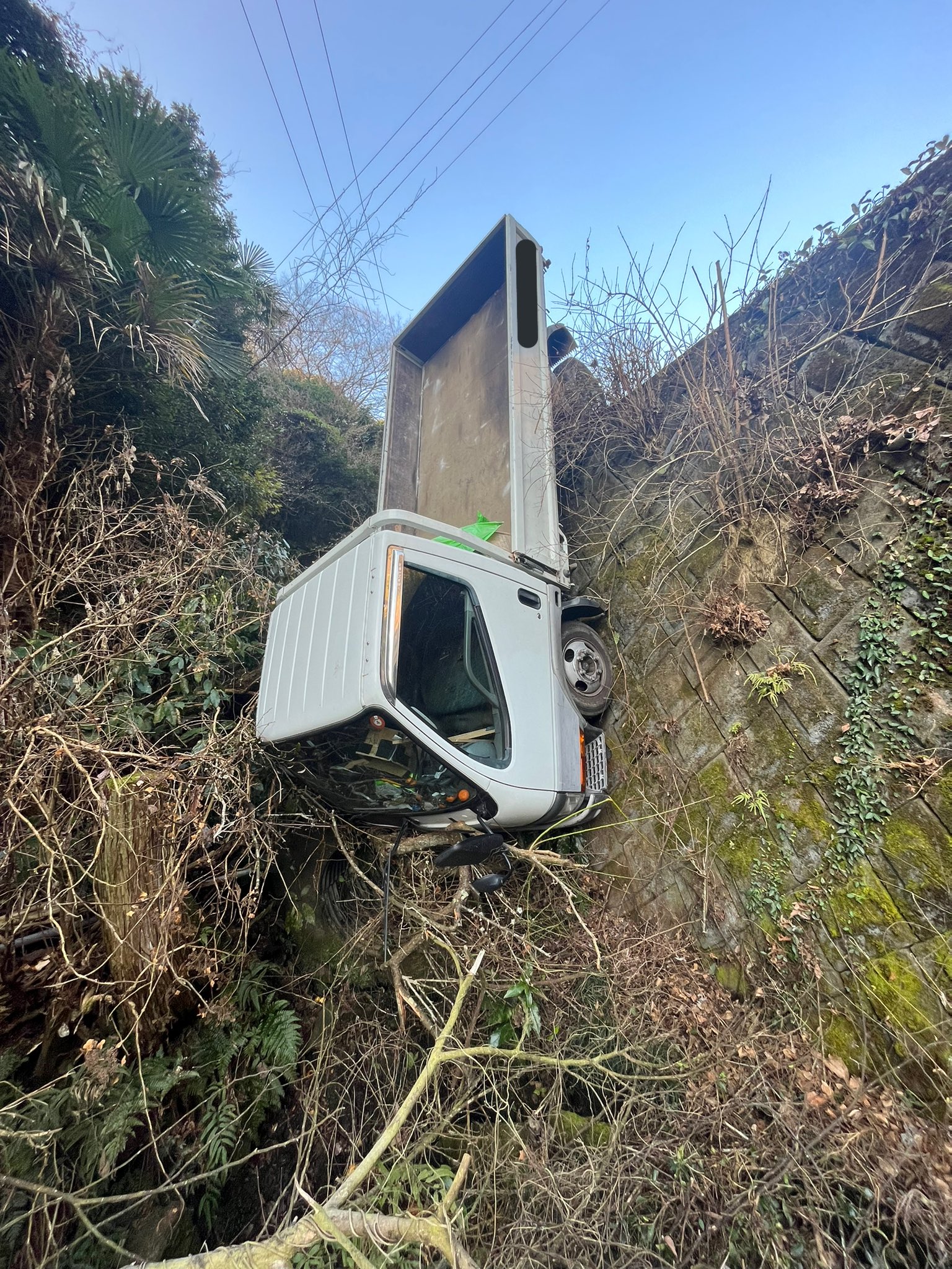 父親から「車を坂に停めてたら動いて脱輪したから引き上げに来て!」と連絡が来たので見に来たんだけど、脱輪が思ってた感じとちがう https://t.co/vav7lHWffM
