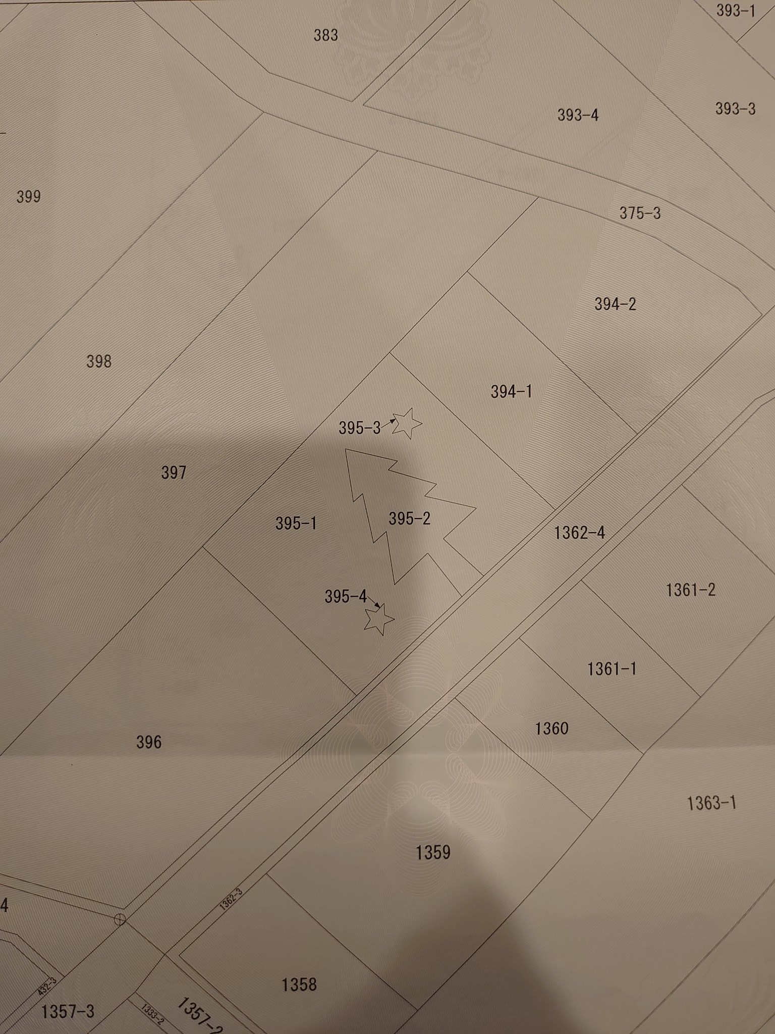 すごい公図を手に入れた。某市某町の土地に、突如として「表れる」クリスマスツリー。なお1362-4は道路。1万歩譲って395-2は接道があるにしても、枝番3と4は完全に遊んでいる。登記簿を取ると、持ち主は測量士。なるほど、プロの犯行か。僕が取ったことある公図の中でもトップクラスに面白い。 https://t.co/NA2leuzAr1