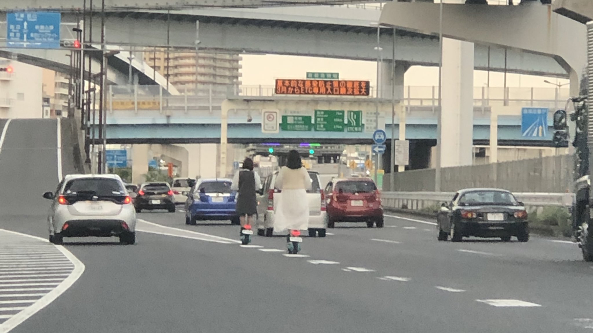 合成ですか?→ズームで画質が荒いですが、トリミング以外無加工です。違法でしょ!→違法じゃないそうです。原付ダメでは?→原付ではなく、小型特殊自動車とのこと。→現場(国道357号有明IC手前)は原付含め規制ないです。一律禁止すべき!→とは思ってません。ルールがおかしいと思います。