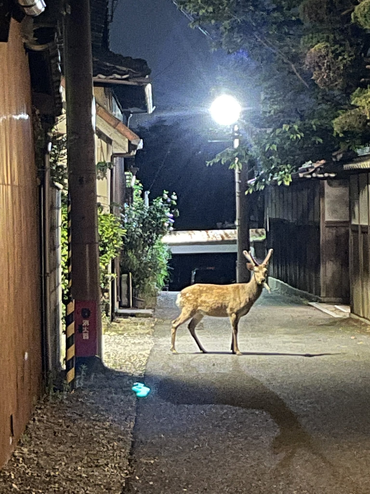 深夜に洗濯乾燥にコインランドリーへ行って、両手に乾いた洗濯物抱えてヒイコラ家の前まで歩いてきたら、お迎えに出てきたのはこの方でした。春日曼荼羅みたいだ。 https://t.co/XIfveWgrZg